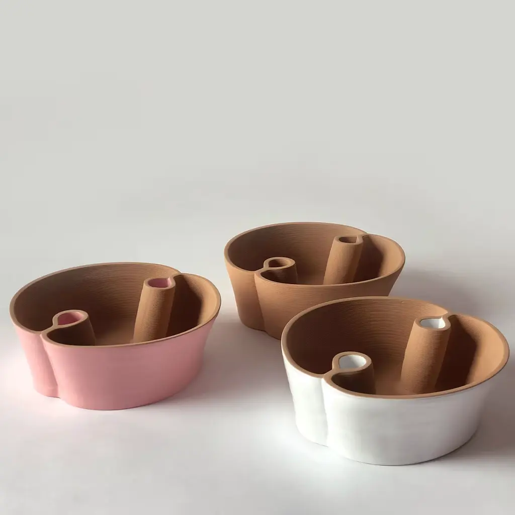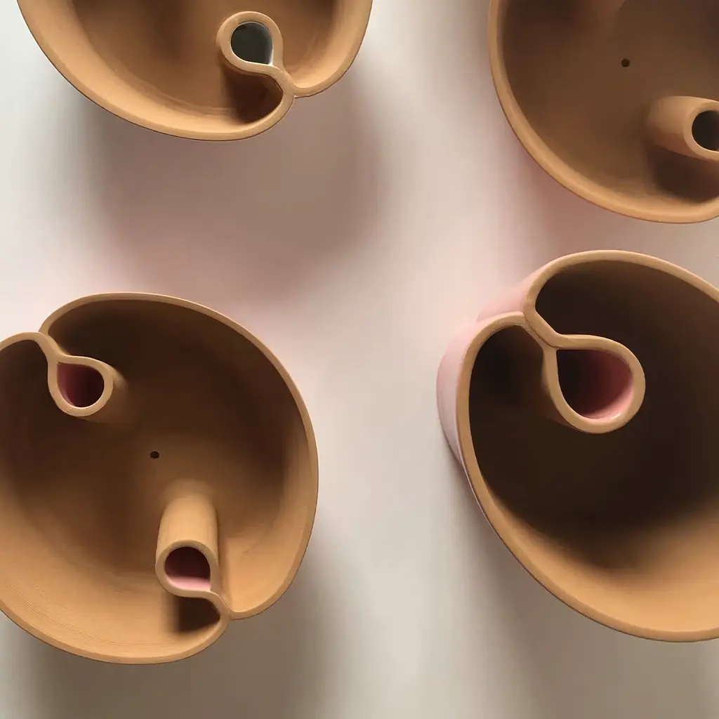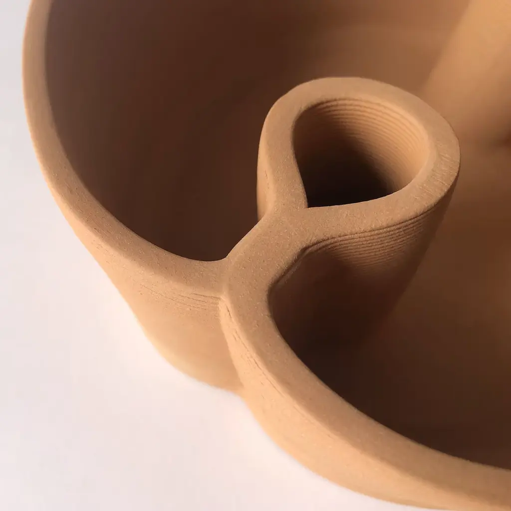 Red clay plant pot, printed with 3D technology. The lines describe a silhouette with flared walls and two tubular, teardrop-shaped water-collecting elements that are activated by the porosity of the clay.