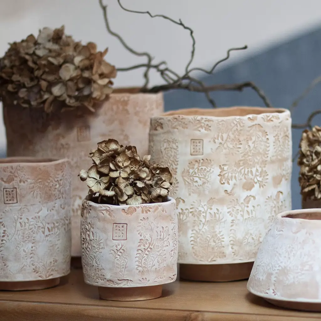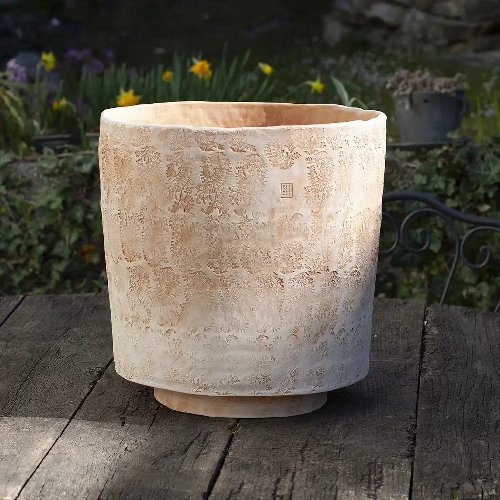 A terracotta vase crafted using the coil technique, featuring a delicate floral imprint texture. The surface showcases natural whitish mineral inflorescences on warm red terracotta, unique to each piece. Designed for both indoor and outdoor use, it promotes root aeration and prevents water stagnation due to its porous nature. Equipped with a raised base to protect surfaces without the need for a saucer, this decorative vase combines classic terracotta charm with distinctive design elements.