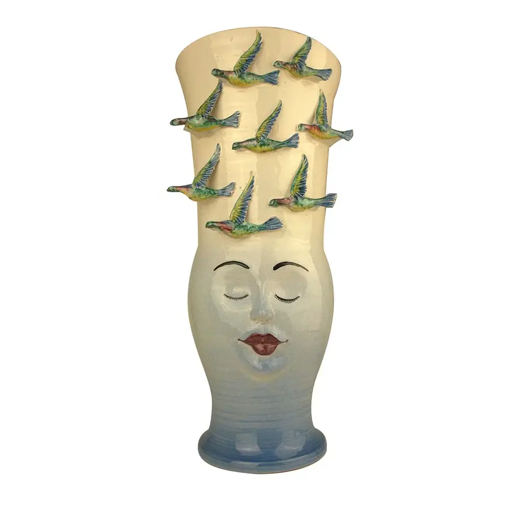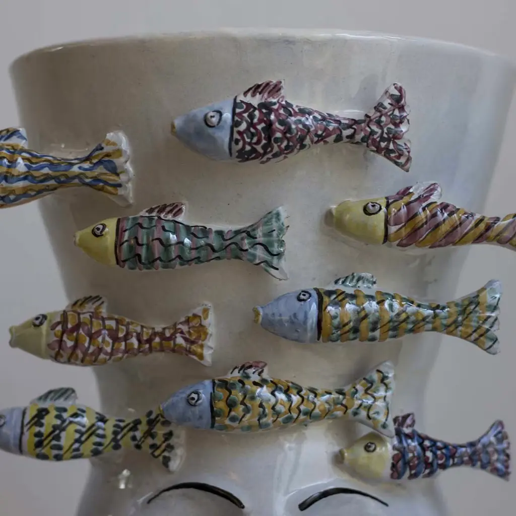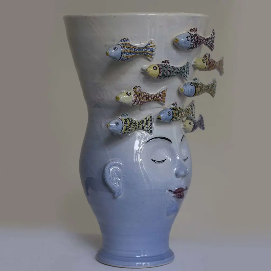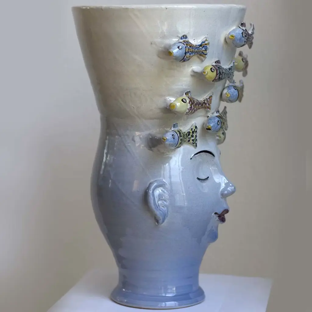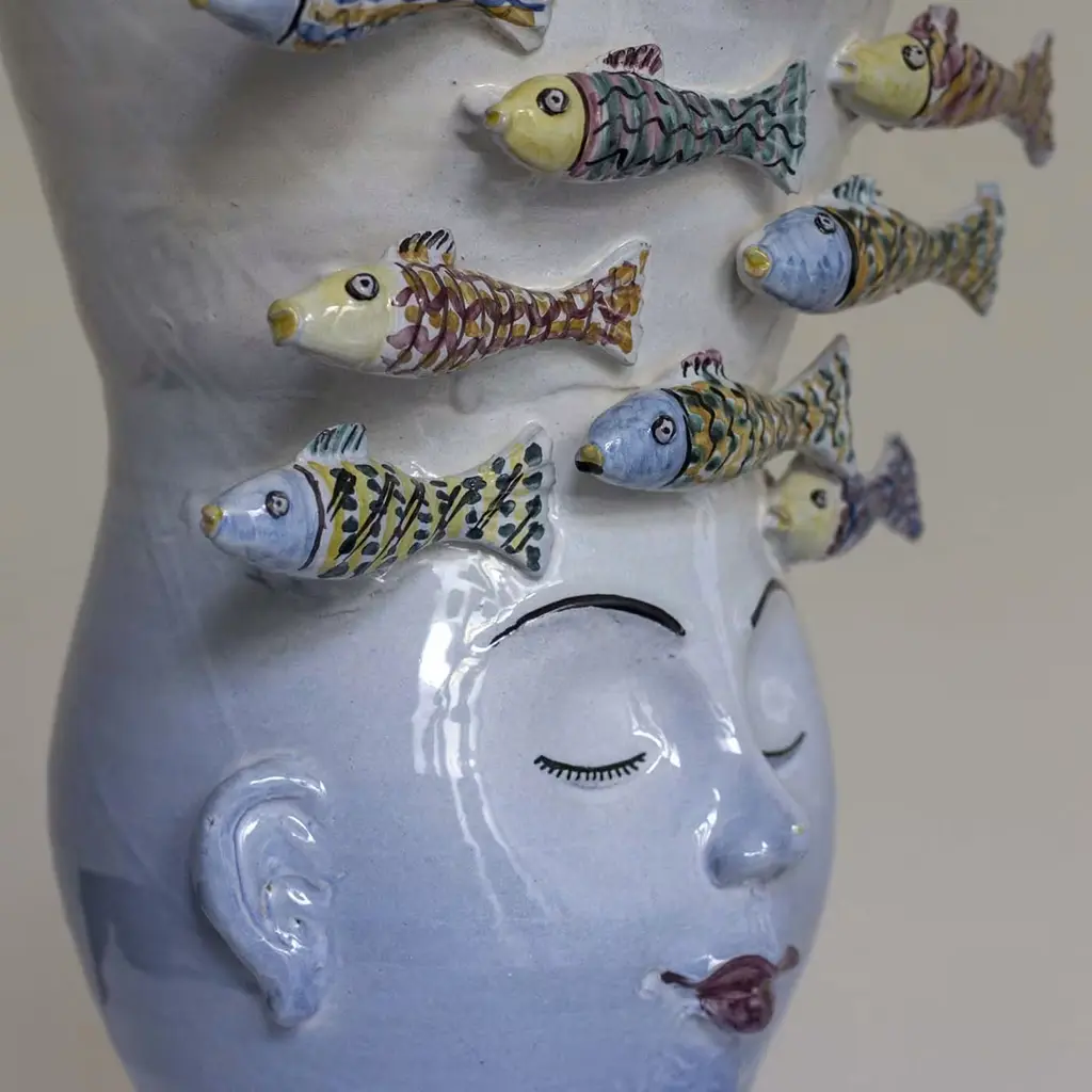 A unique and eclectic vase that will make a statement in any modern interior, this piece was crafted by hand. Its visually imposing design comprises a sinuous body in the shape of a woman's head with her eyes closed. On her forehead, a school of fish with vibrantly colorful bodies, delicately swims. This three-dimensional decoration adds a dream-like element to this unique design that will be eye-catching in any room of the house, either carrying a floral decoration or as an empty sculptural object.
