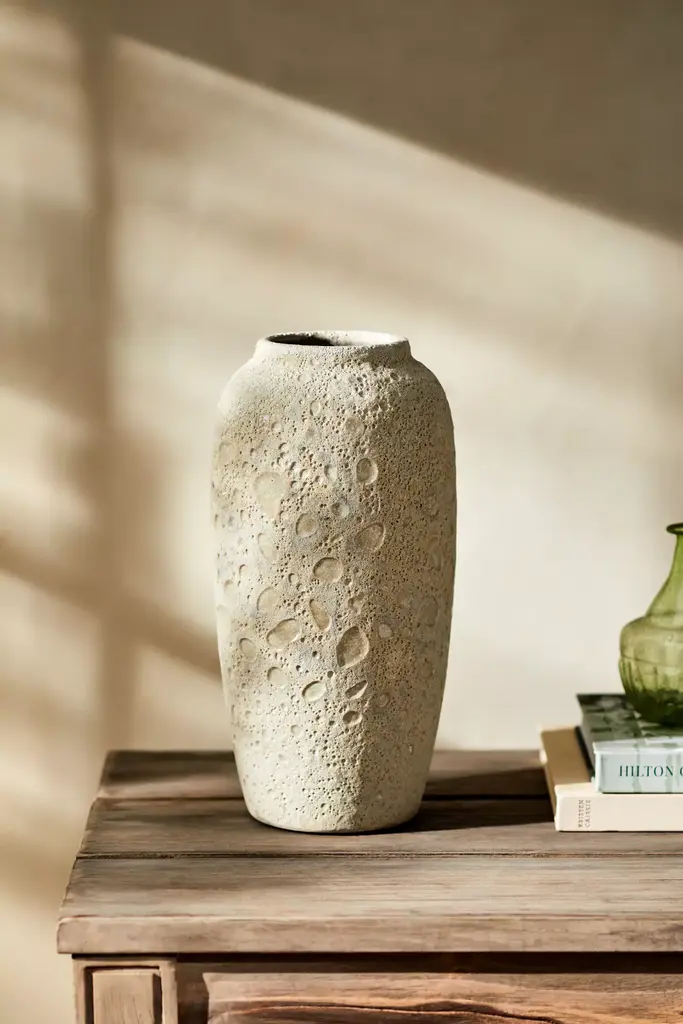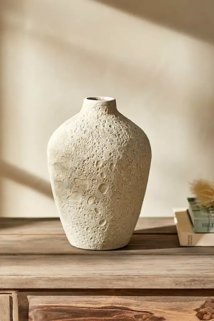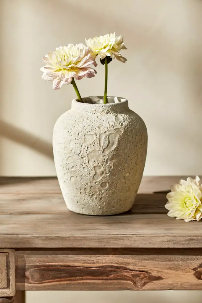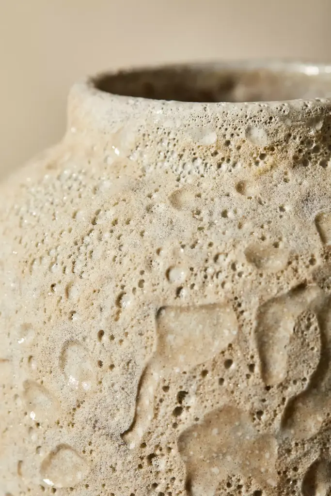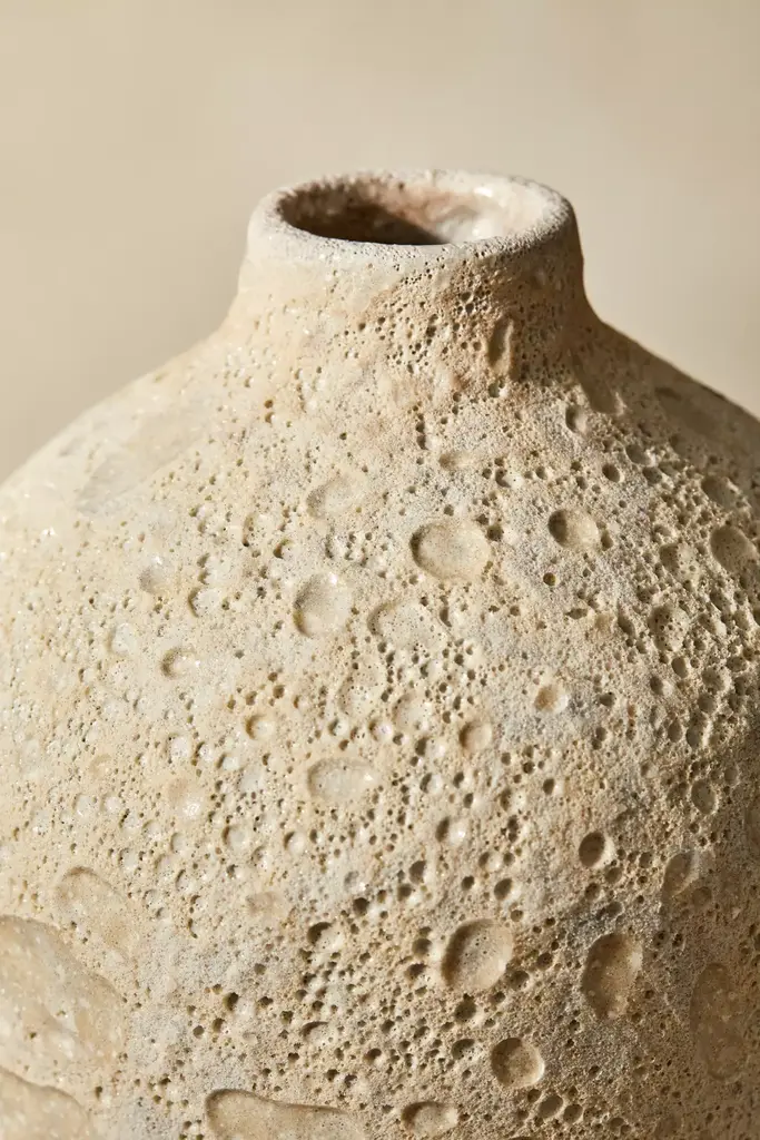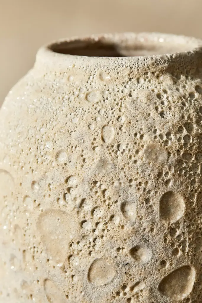 Generously sized, this textured cream vase adds a dose of modern drama to your most inspired arrangements. Suitable for dried or foraged elements. Note: Vase is not completely watertight. If using with fresh stems, please place saucer or tray underneath vase to protect surface from potential minor water seepage.