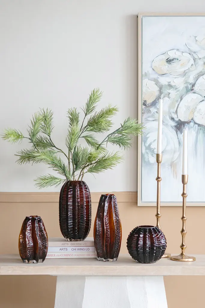 Drawing inspiration from modern artwork, this glass vase features a textured cylindrical silhouette, embellished with a deep amber finish that completes the allure. Display it as a lone accent piece, as part of a stylish vignette, or as the vessel for a small collection of flowers.