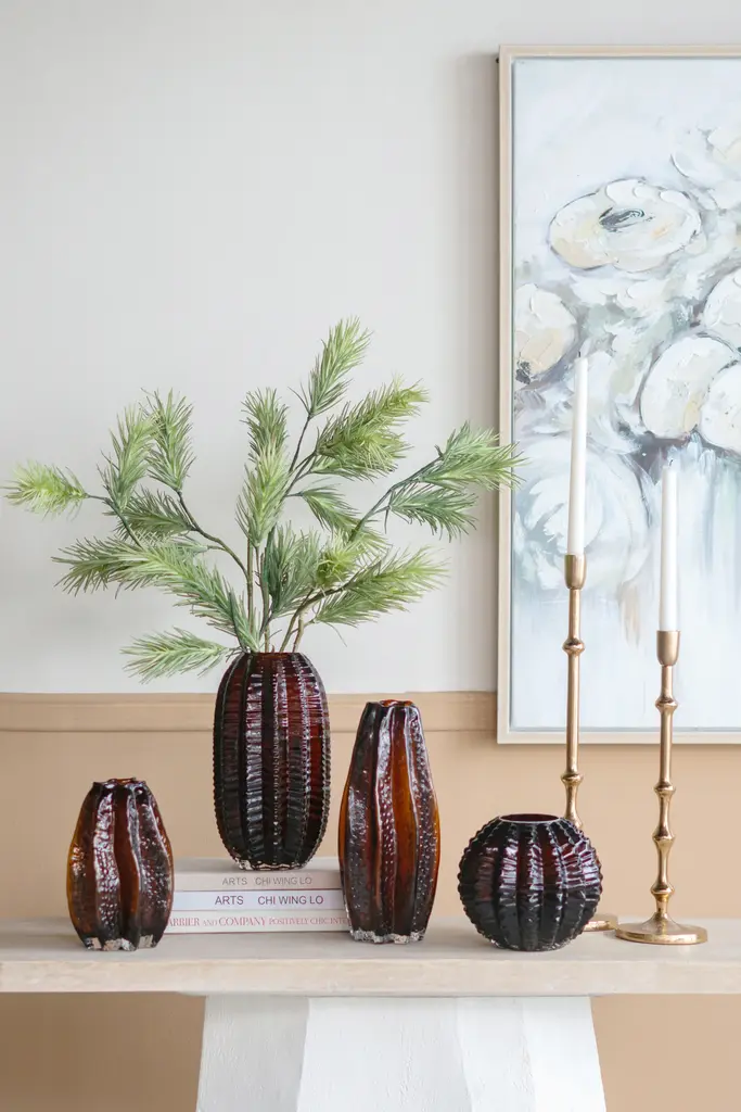 Drawing inspiration from modern artwork, this glass vase features a round, textured silhouette, embellished with a deep amber finish that completes the allure. Display it as a lone accent piece, as part of a stylish vignette, or as the vessel for a small collection of flowers. Measuring 6H x 6.5D, it is an ideal size for your living room mantel, entryway table, bedroom dresser, or dining room sideboard, adding a sense of elegance to any space in your home.