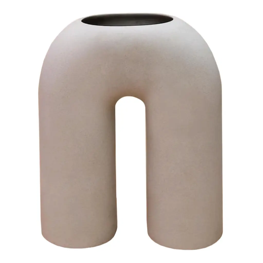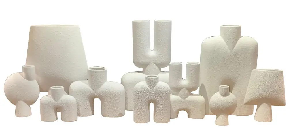Contemporary Danish design small textured white ceramic vase with center round spout on a base of two round spheres.Very sculptural in design.Same shape different sizes available S5602 and S5615.