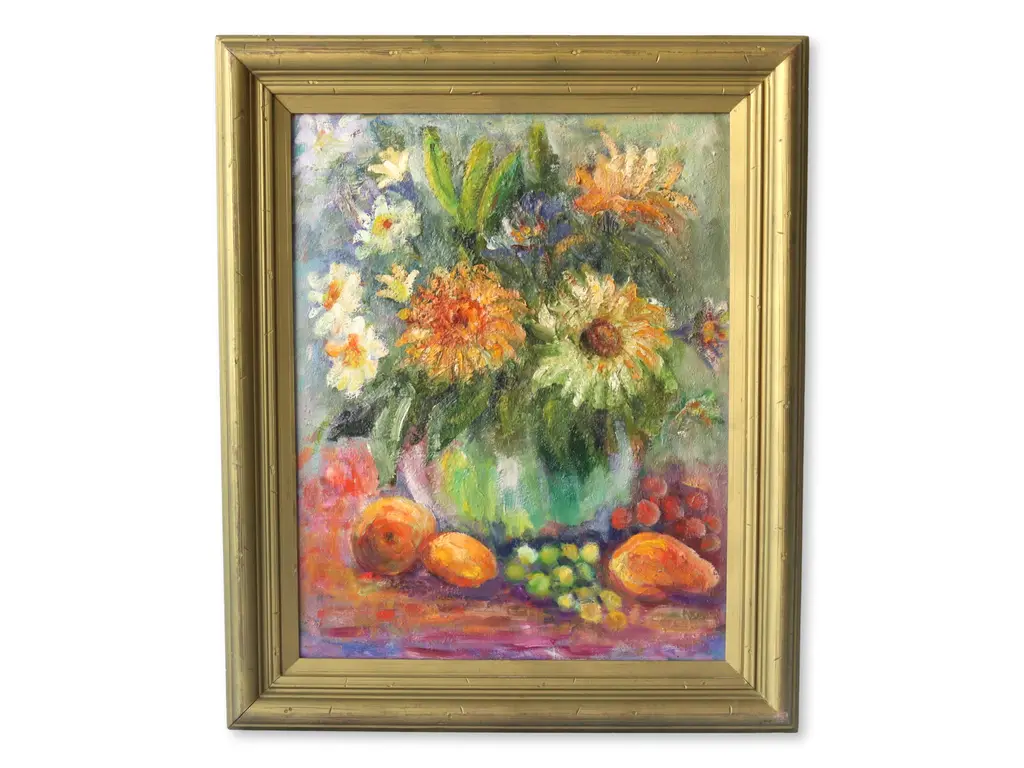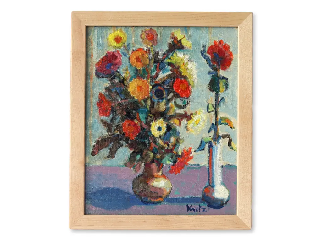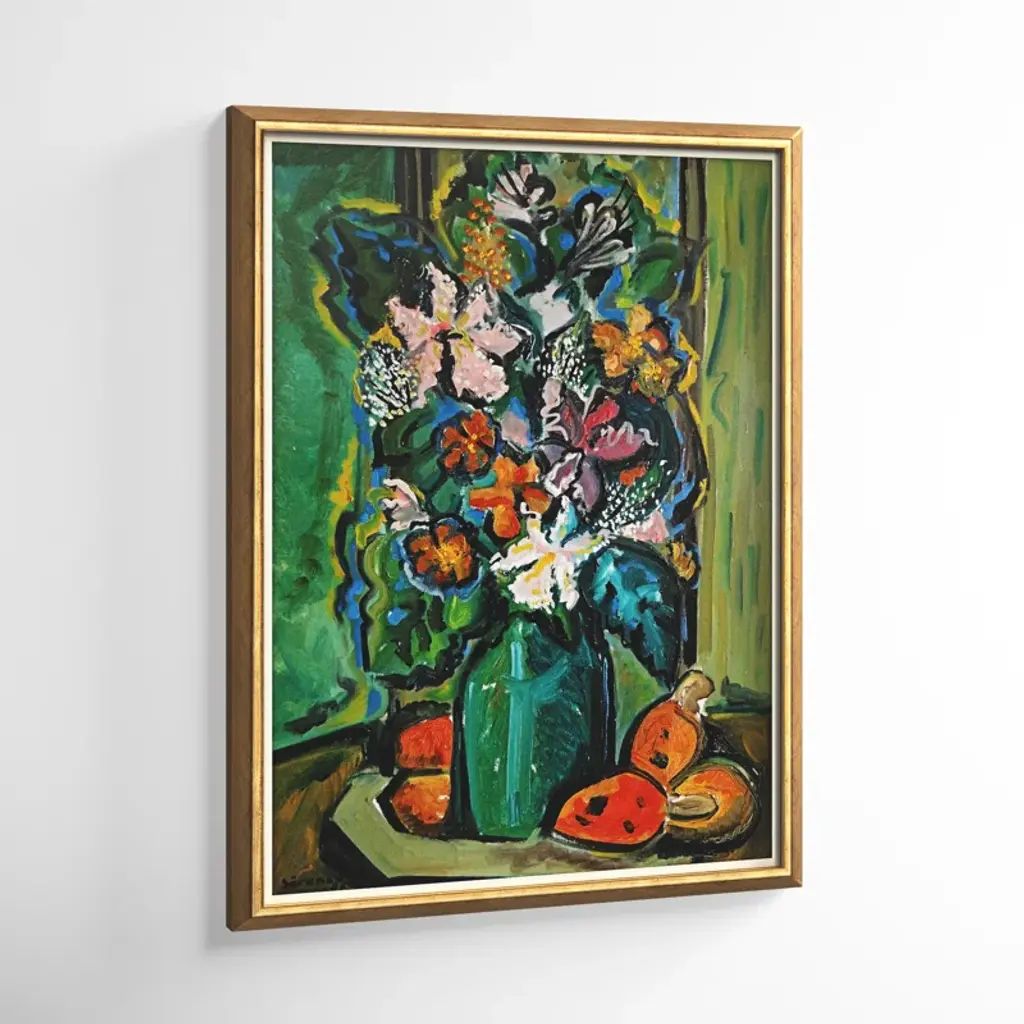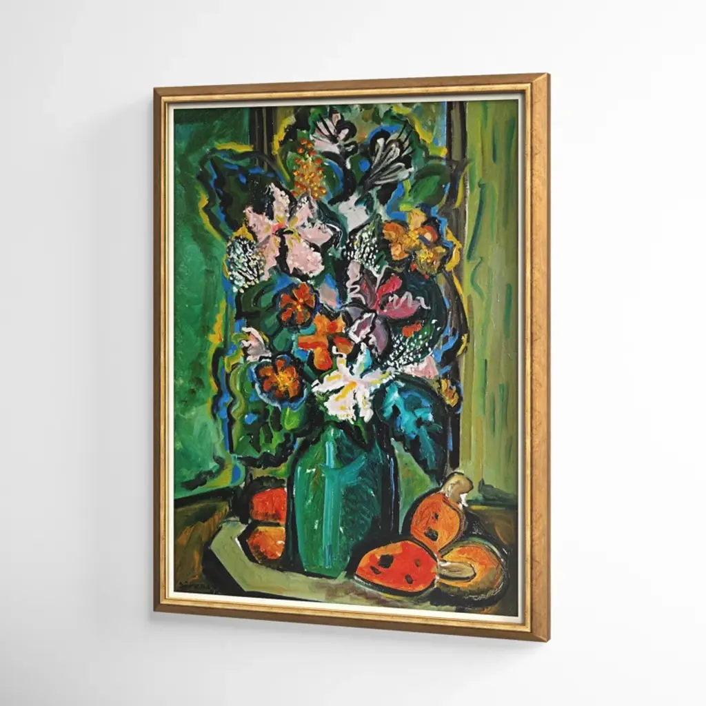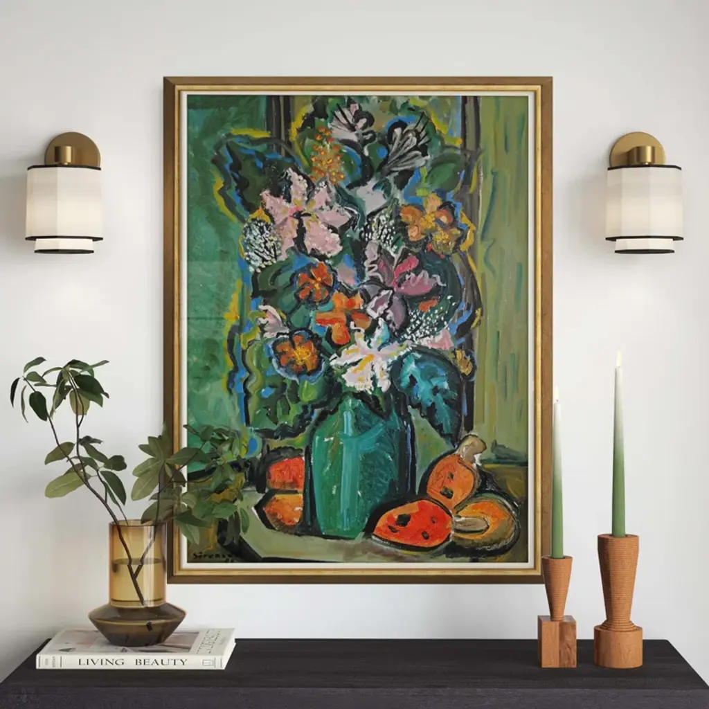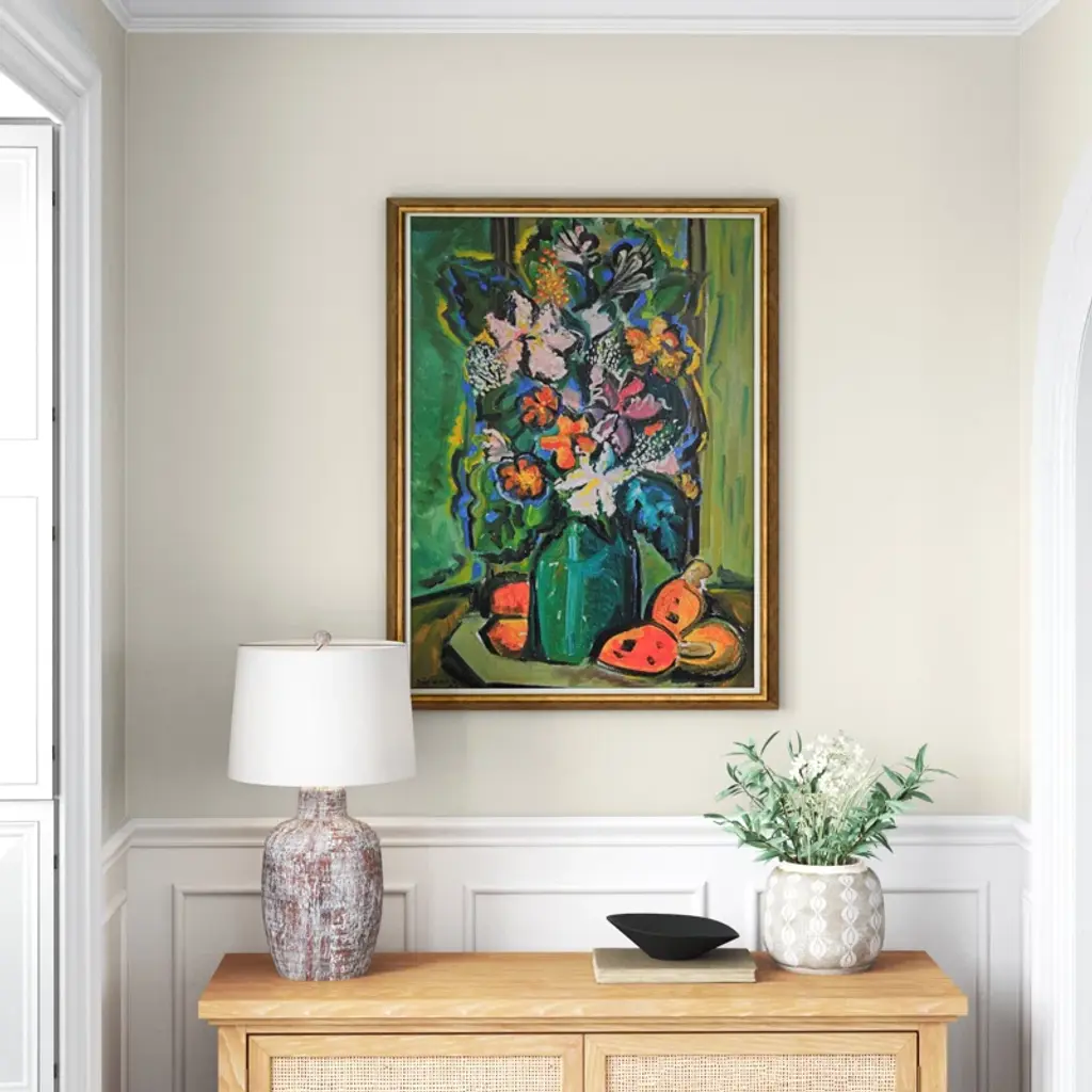 Ready to start your gallery wall? This framed painting print on paper showcases a blue vase overflowing with a green and orange flower arrangement. We love how this print adds a pop of color to your bedroom, living room, or office. This piece is protected by a glass sheet and surrounded by a beveled, metallic frame. Plus, it comes with mounting hardware for easy hanging.
