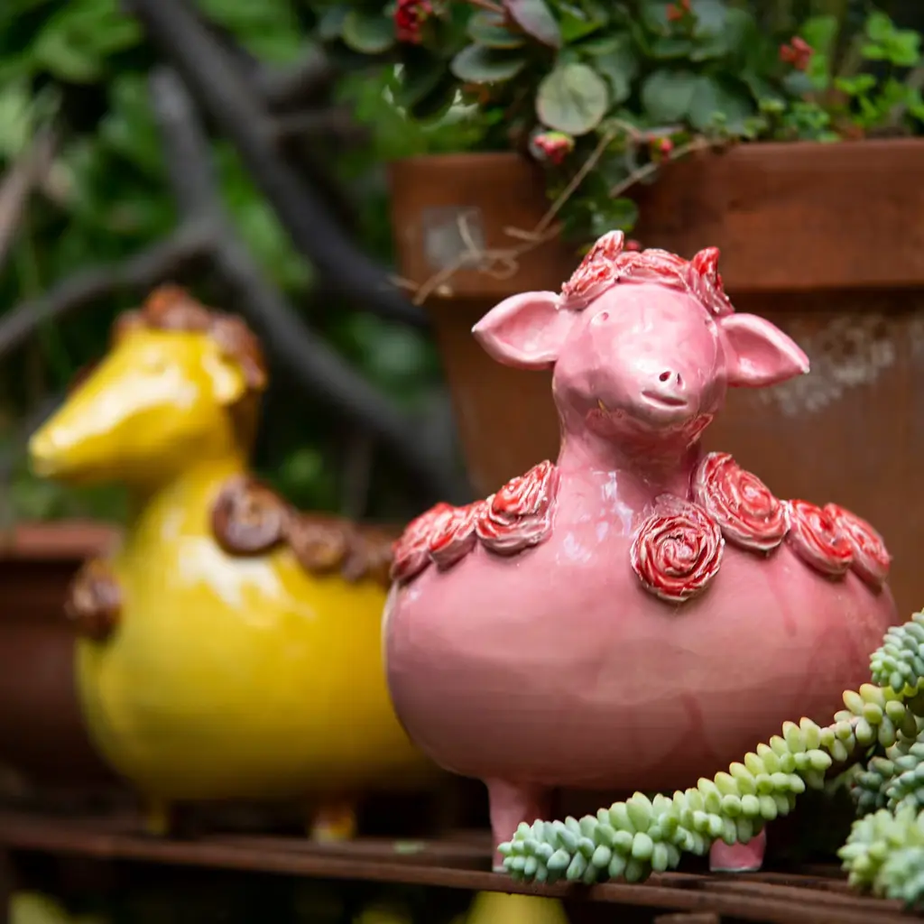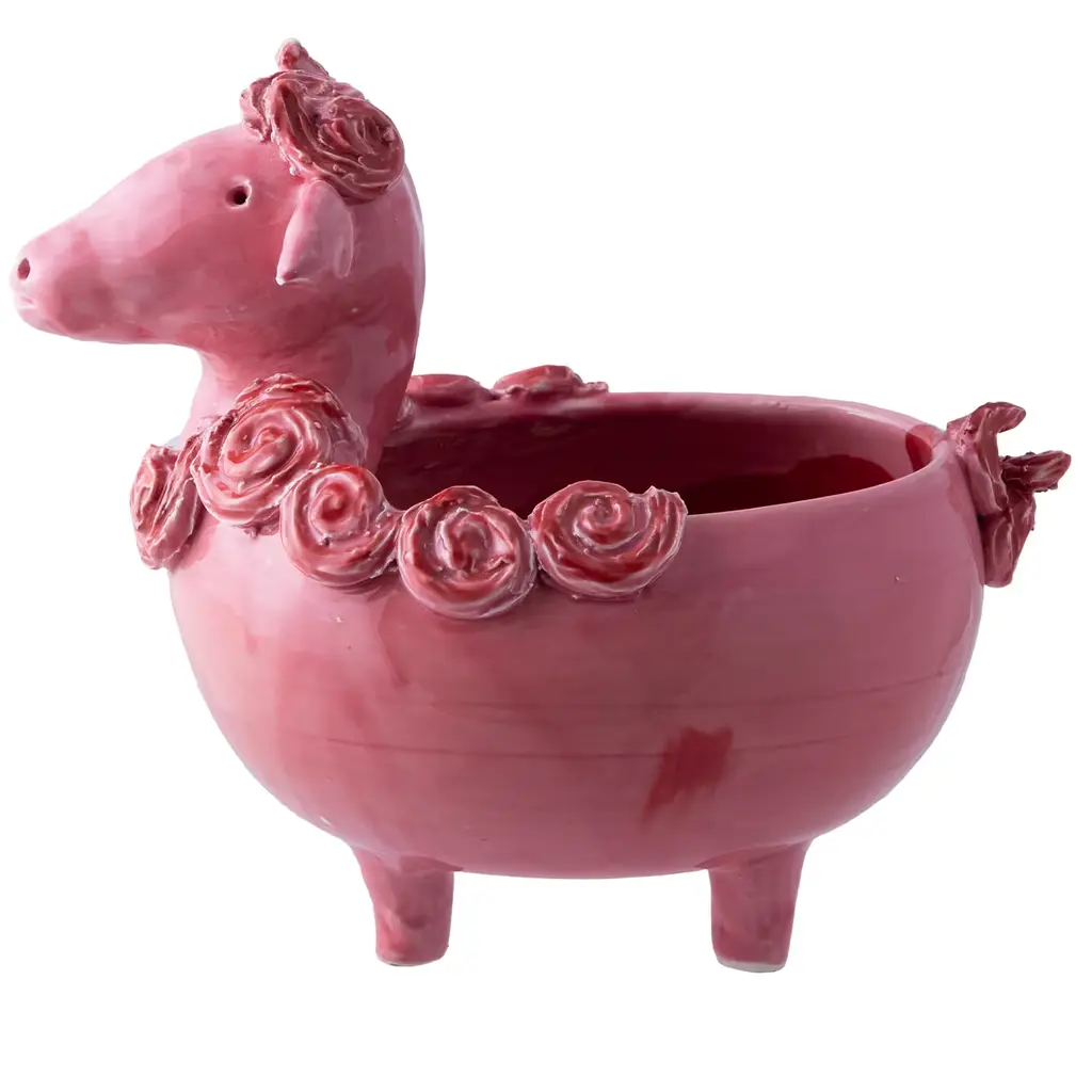 The pink sheep is always smiling and has a good character, it is handmade in white clay and reliefs with colored crystalline cooked on high fire. It can be used as a container in the kitchen, as a plant holder or flower holder.