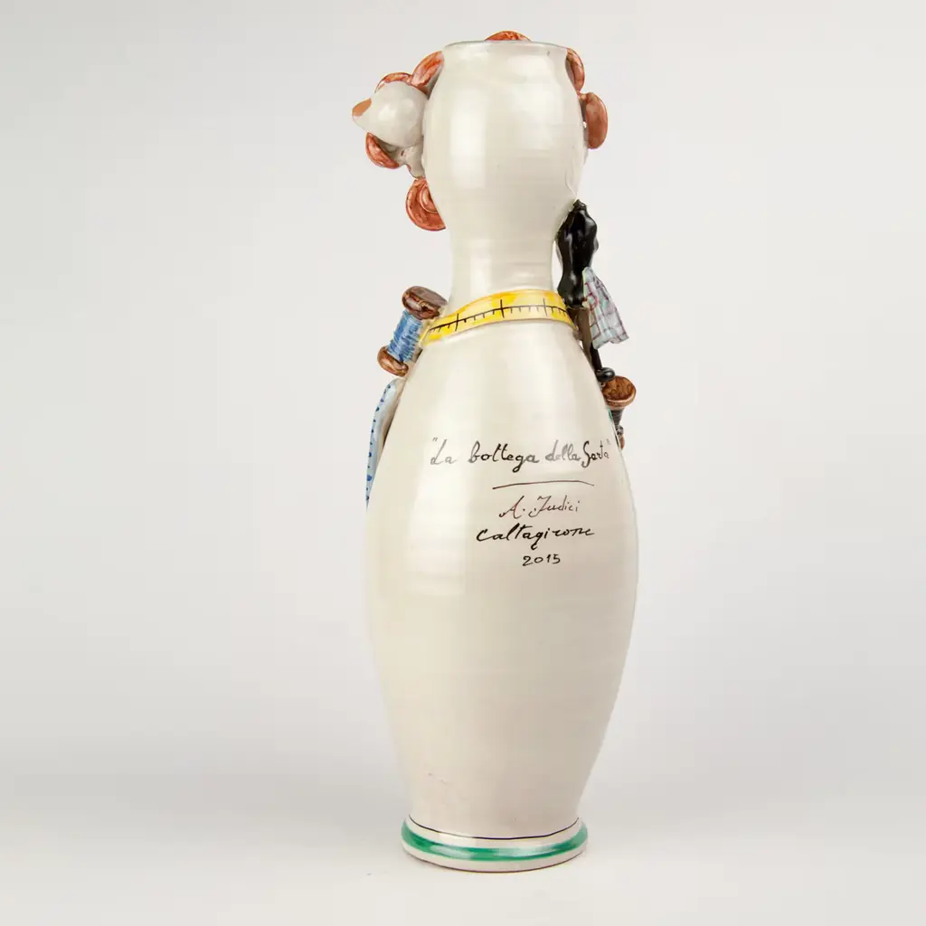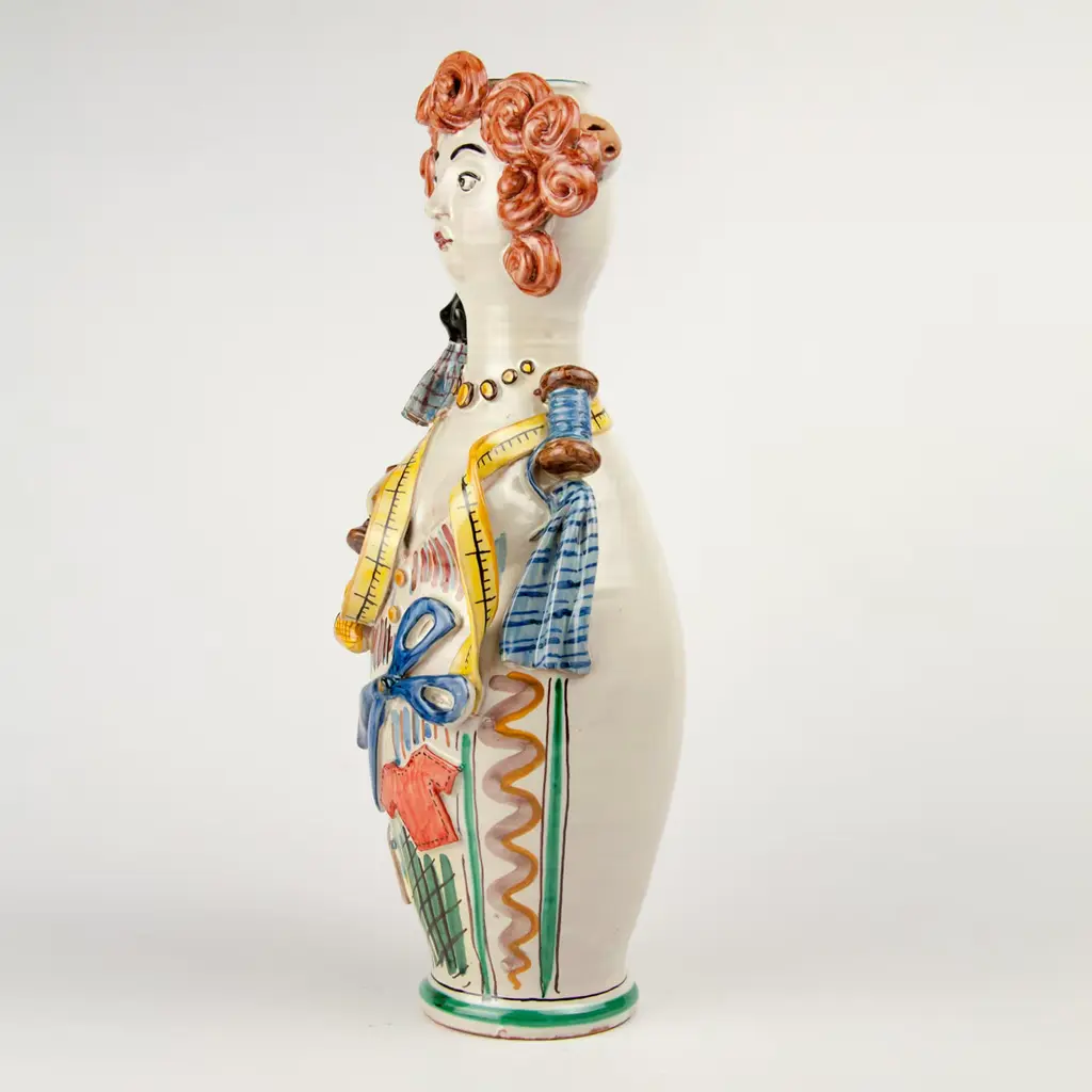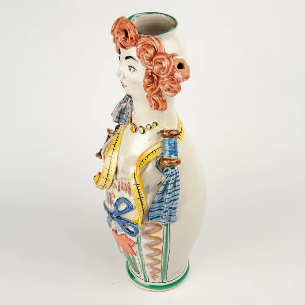 This marvelous whistling vase was achieved using a combination of a lathe, and hand modeling of the details. The vase depicts a seamstress complete with all of her distinguishing accessories. The whistling device is hidden in the hair of the seamstress.