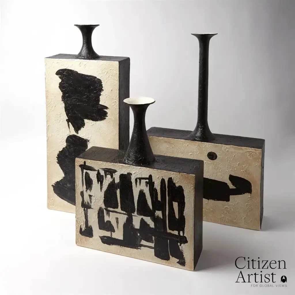 Inspired by the pottery of Pompei, each handmade ceramic vase in this trio is as dramatic alone as they are together. Finished with unique motifs, painted by the principal designers of FORM Design Studio, these pieces are artisanally realized in Italy by two brothers in their studio. From a fashion forward perspective, Global Views offers accessories, furniture, statement lighting, and an assortment of rugs and mirrors to add beauty and joy to your home.