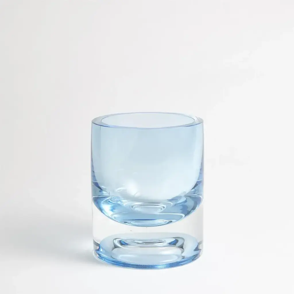 Polish art glass. The incased color is accomplished by blowing colored glass in layers. Vase is hand crafted thick layers of clear & blue art glass. This artisan process produces substantial and important pieces. From a fashion forward perspective, Global Views offers accessories, furniture, statement lighting, and an assortment of rugs and mirrors to add beauty and joy to your home.