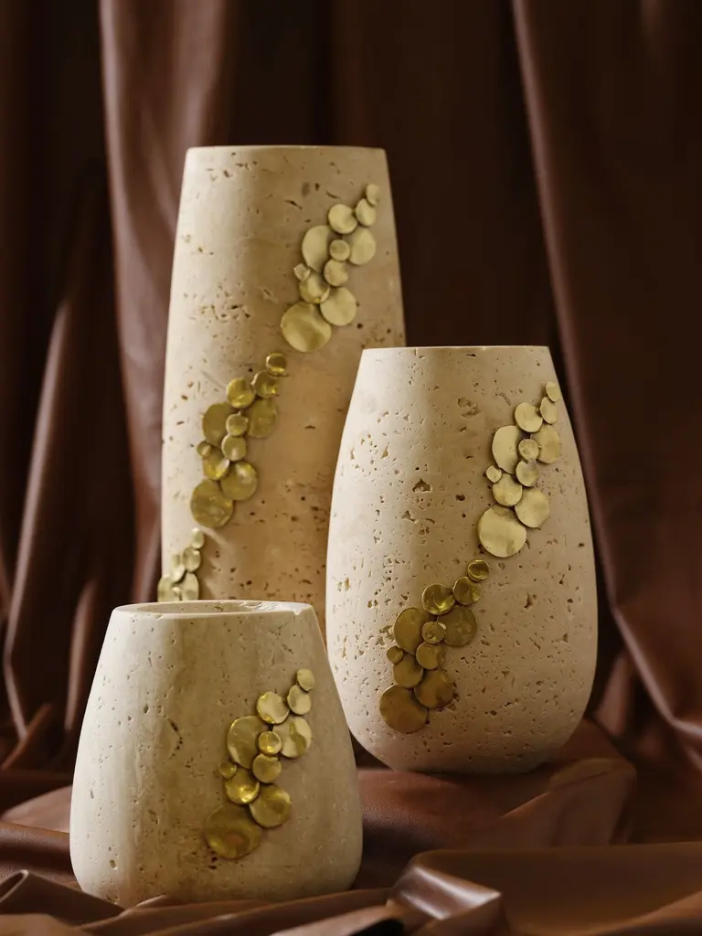 Three-Piece Travertine Lexi Vase Set – Sculptural Arrangement With Brass Detailing