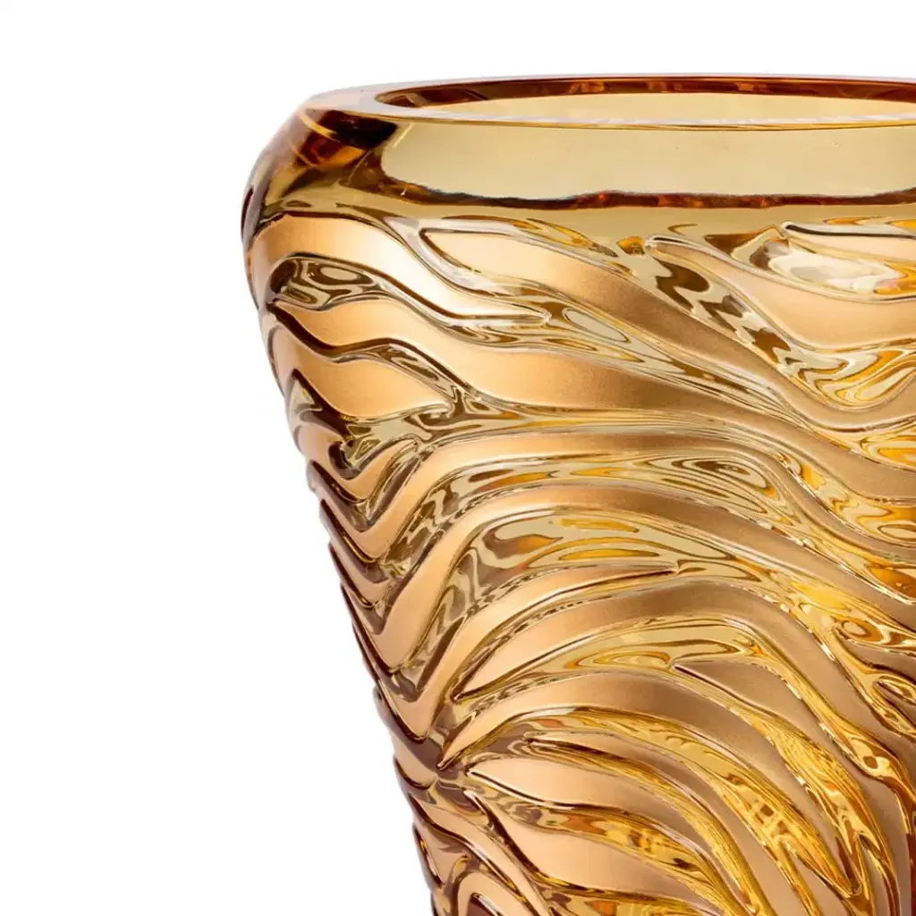Through the incredible magic of blown crystal, lines interweave and the Zebra Vase breathes life into a powerful tiger. This jungle genius' flowing fur rushes for the light. The coats of Lalique's tigers, featuring amber, as well as a duo of limited editions enamelled with black or ultra-golden lines, merge and become one with the decor. Trained as a jeweler at the Ecole des Arts Decoratifs in Paris in the late 1880's, Rene Lalique gained recognition as an independent designer for some of the era's great jewelry houses including Cartier and Boucheron. Eventually, he turned to glassmaking, and his techniques were a triumph for the Art Deco movement. Every piece of Lalique is finely detailed and produced by hand in Alsace, France.