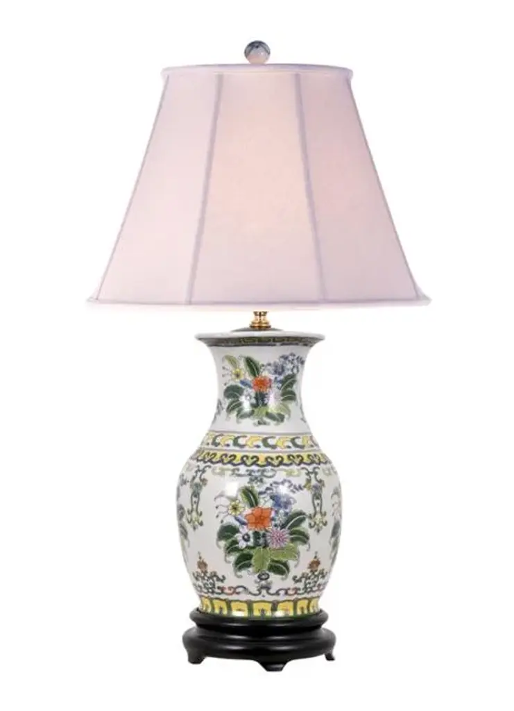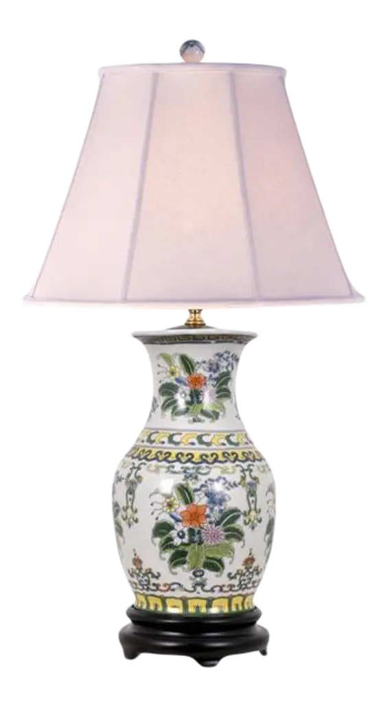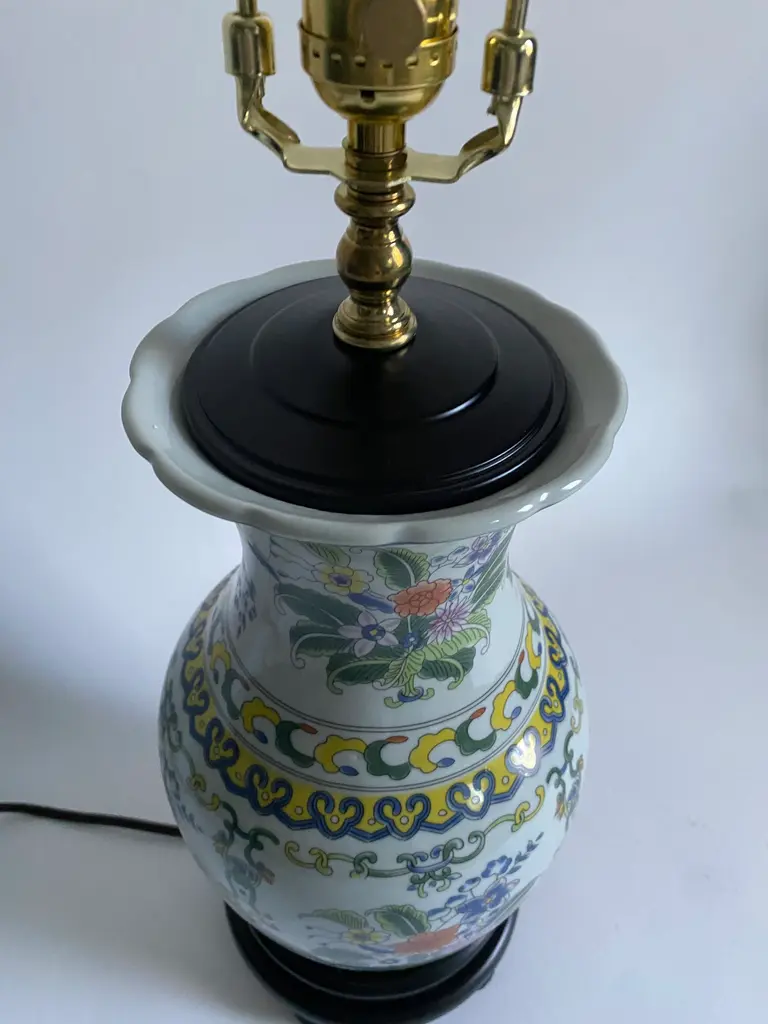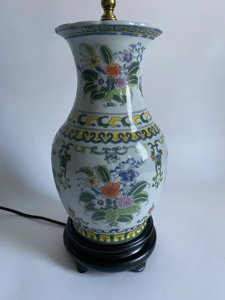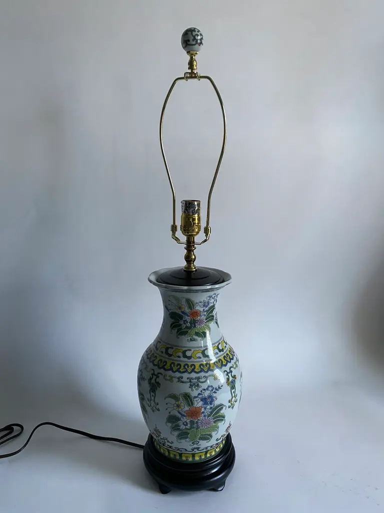 Vase style porcelain table lamp with a tobacco leaf design. Lamp shade is included. 20” to the top of the socket, 28” to the top of the shade. Max 150 watt bulb.