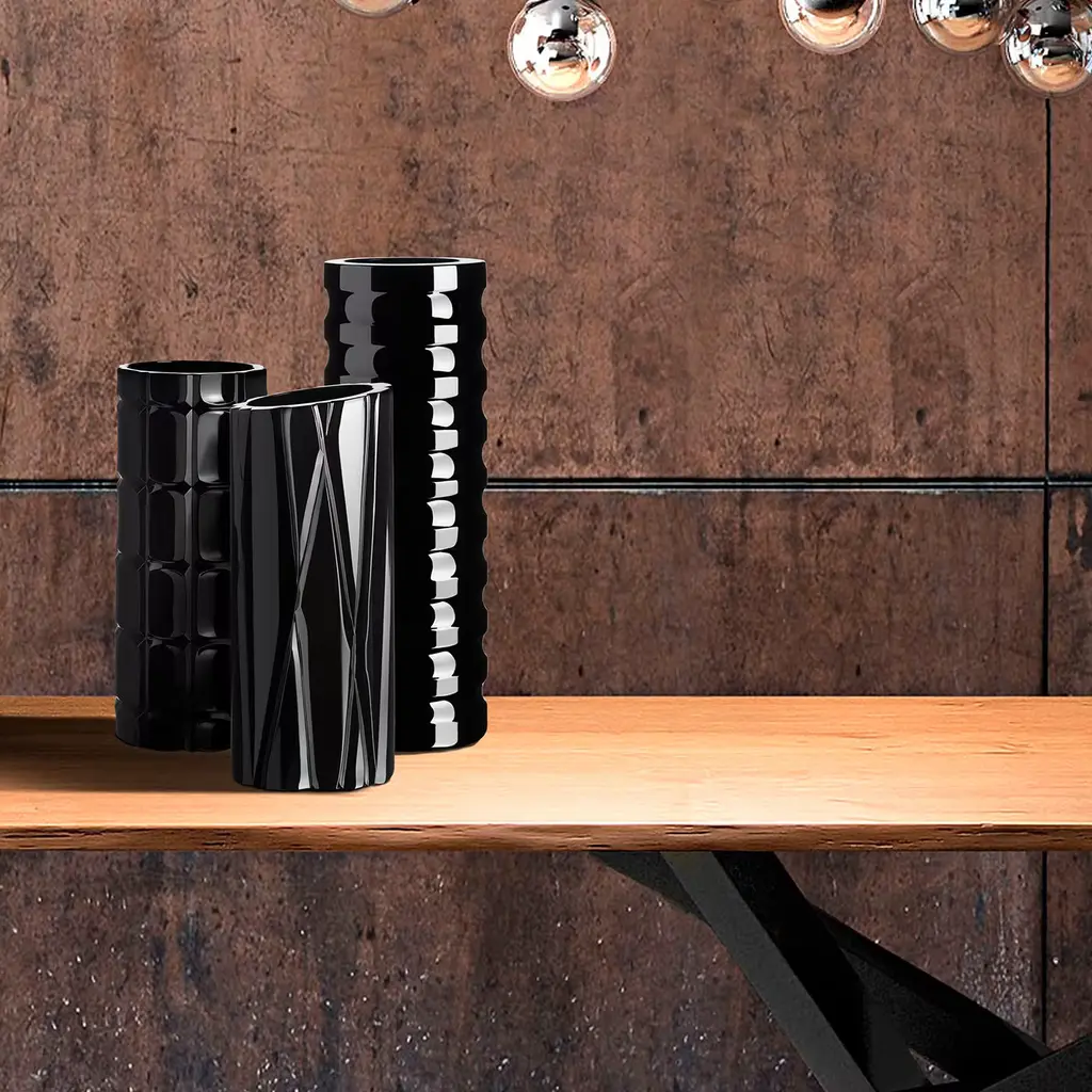 A sleek and sophisticated homage to the skyscrapers that define the look of large modern cities, this vase is an elegant choice for a contemporary home, where it can be combined with the other pieces in the Skyline collection for a dynamic effect. Entirely crafted of crystal, this piece has a black glossy finish and a series of concave horizontal rings that create a dynamic silhouette on its cylindrical shape.
