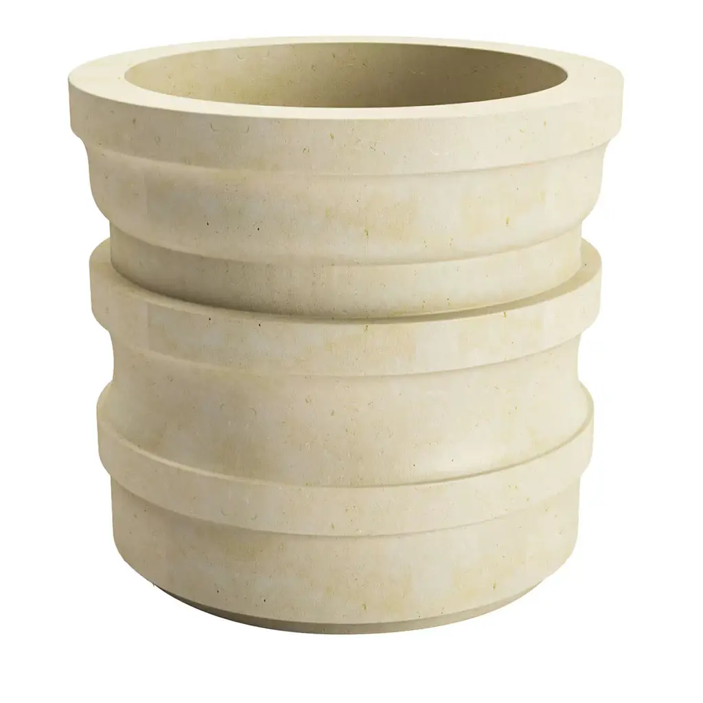 Carefully worked on a lathe from Lecce limestone, this vase is an ode to geometric volumes. Indented profiles lend the cylindrical body striking textural and visual dynamism, an effect reinforced by local limestone's natural brightness thanks to its exceptional ability to absorb light. A design by Luca Scacchetti, each piece is entirely unique.