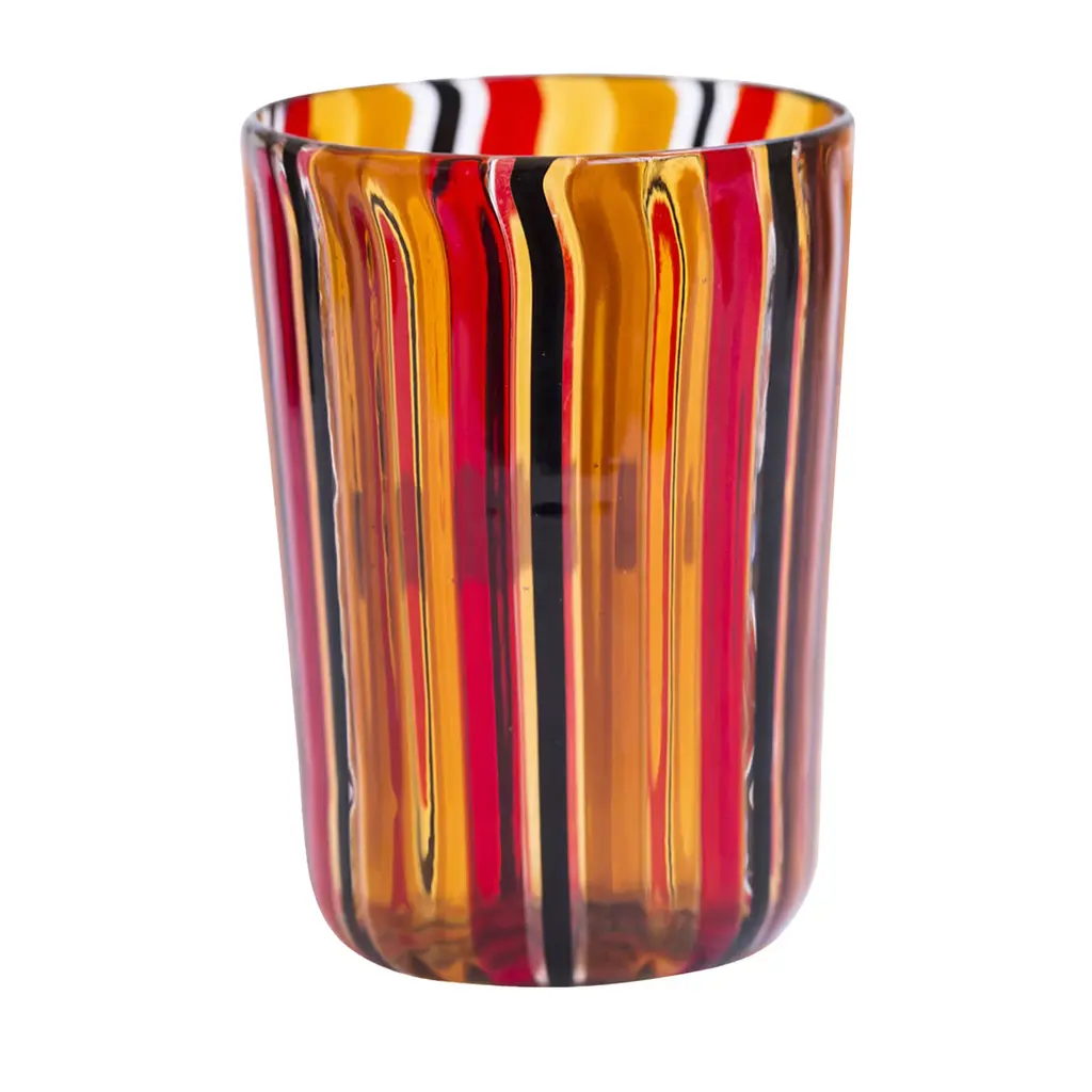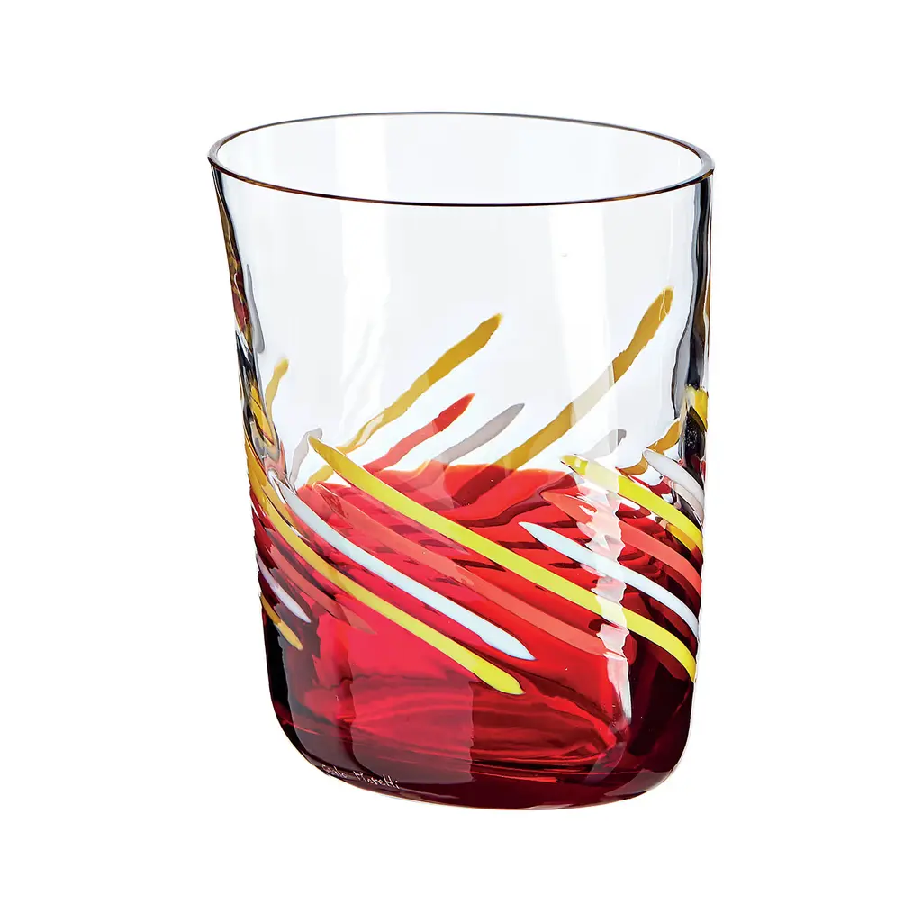 This stunning vase is handmade in Murano glass by Angelo Ballarin. With the filigree technique, which is the combination of glass rods of various colors, in this case red, green, yellow and blue, the vase creates an illusion-style play of colors with the right lighting. A twisted effect in the center called a Torsion provides a unique aspect.
