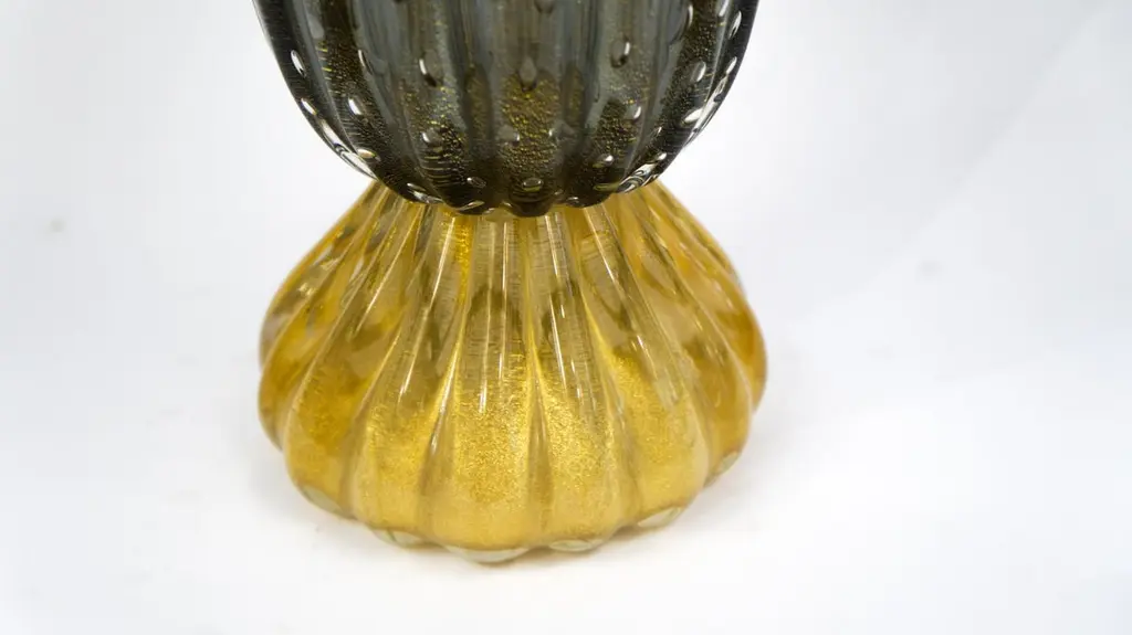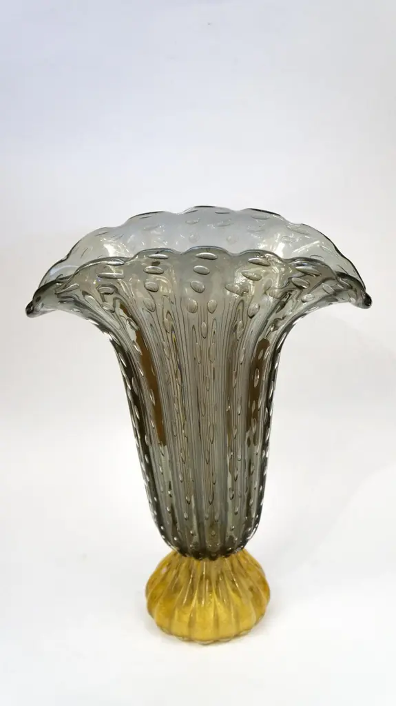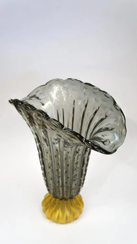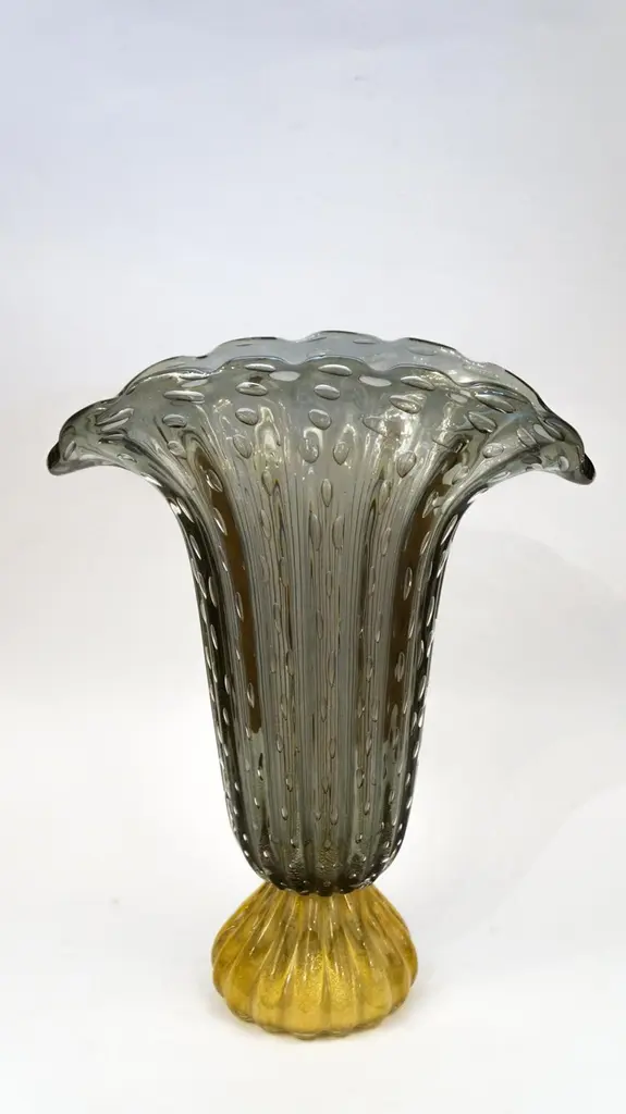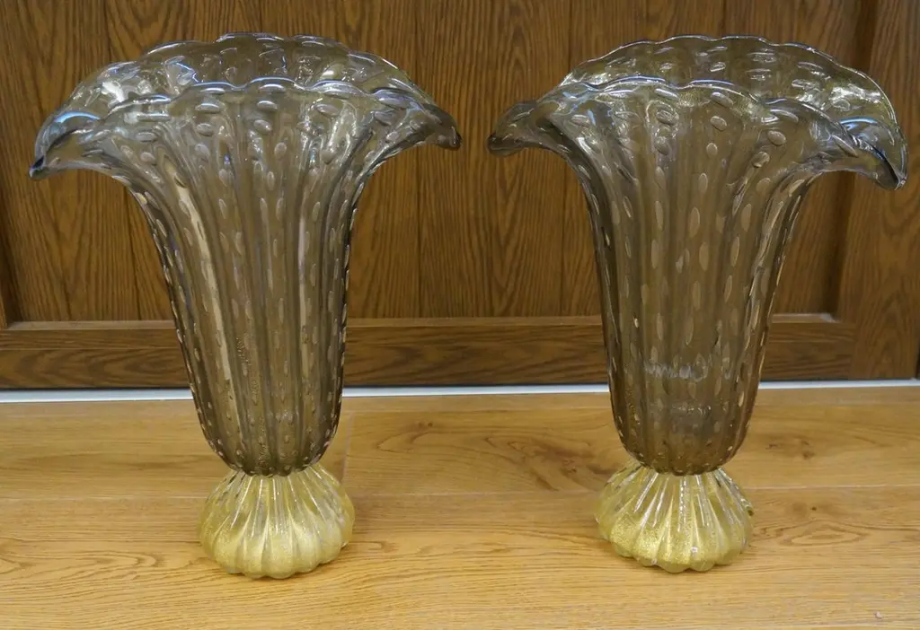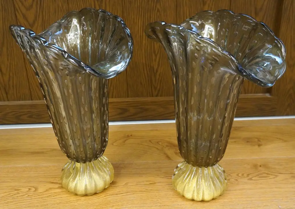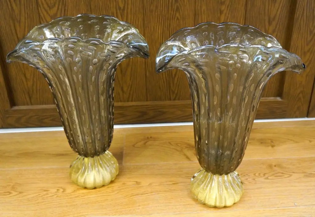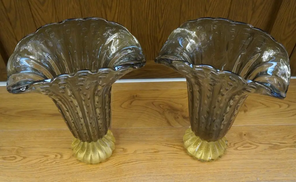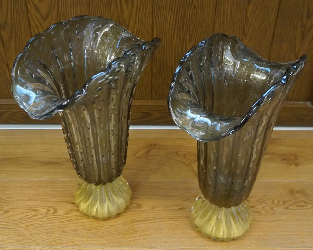 Designed in 1987 by Toso Murano, these vases are Classic but rather elegant. They will give a touch of class to your room.Grey color with 24k gold leaf decoration and internal bubbles. Project by Toso Murano in 1987sVases signed with engraving: Toso MuranoAn original Murano glass vase represents the symbol of an art and a millenarian work, it represents the unique and indistinguishable state of a work of art made especially for you, only for you, because each piece is unique, as handmade by expert Venetian masters, which embody the art of centuries.The price of the item includes professional and tailored packing.
