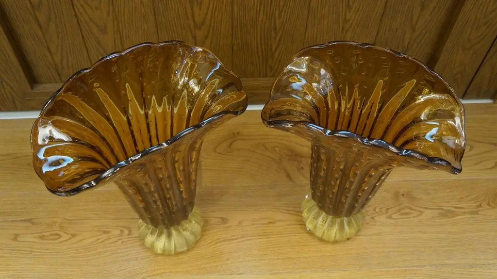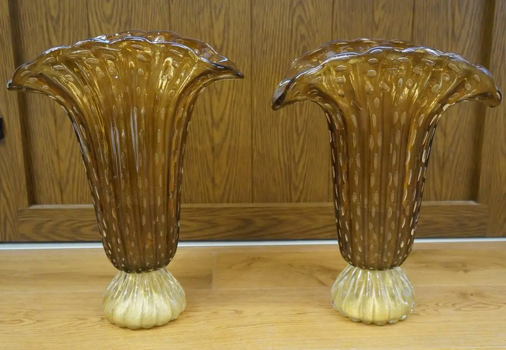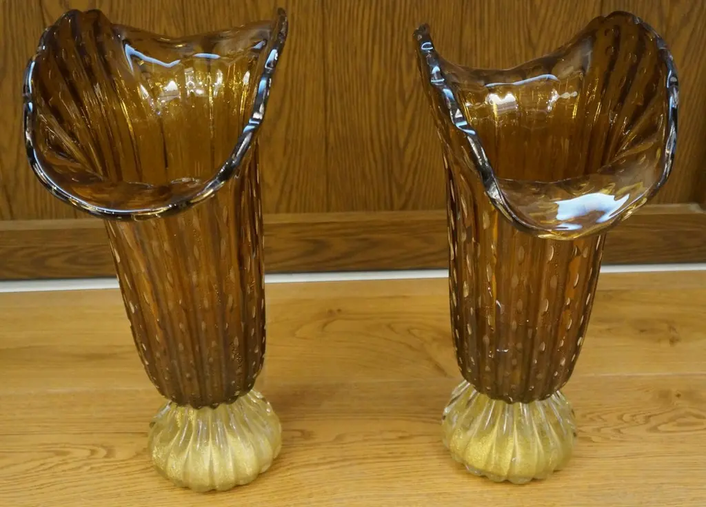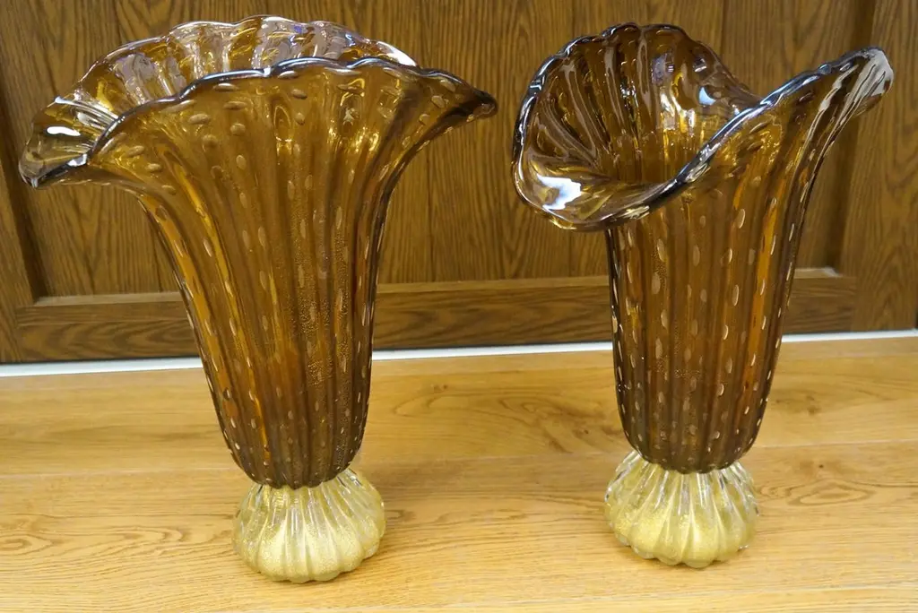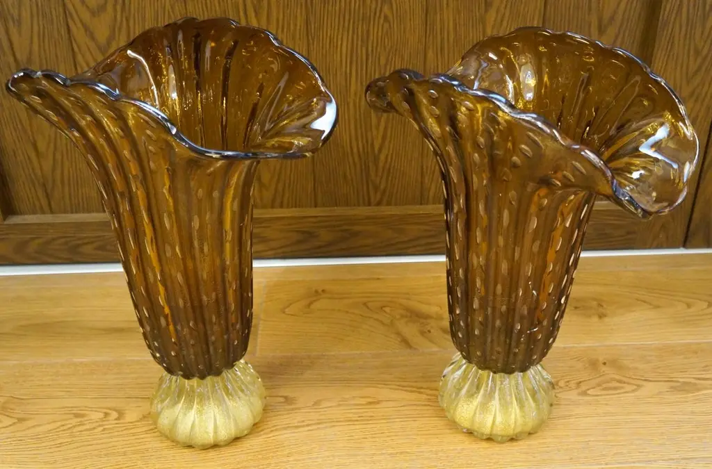 Toso Mid-Century Modern Tobacco Gold Pair Of Murano Glass Vases Signed, 1987