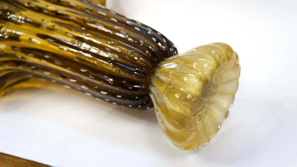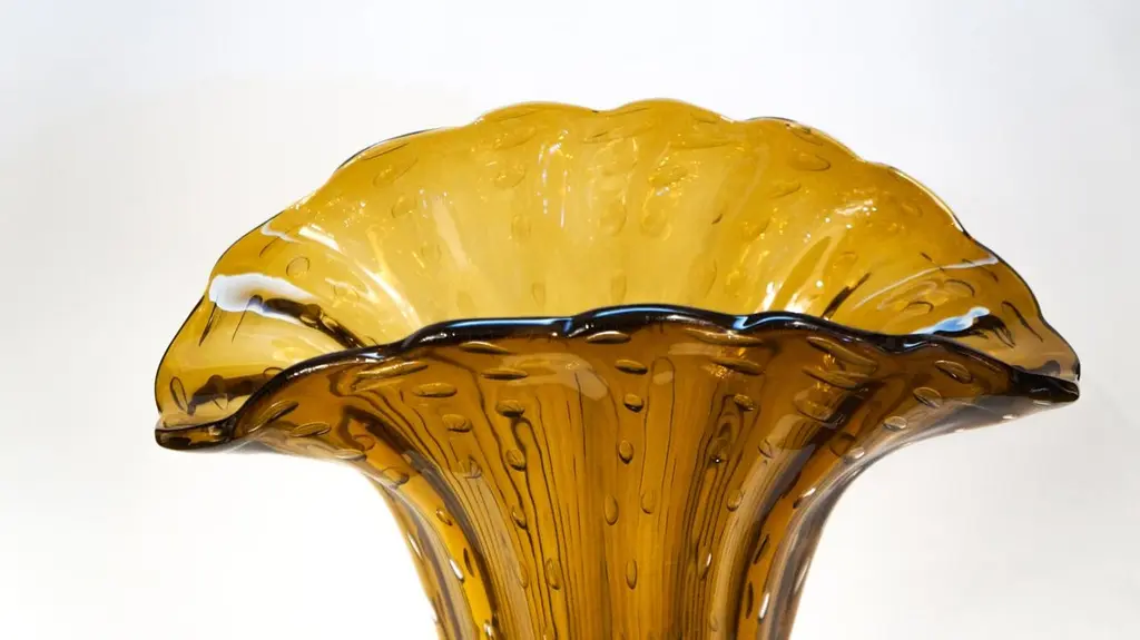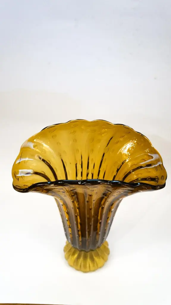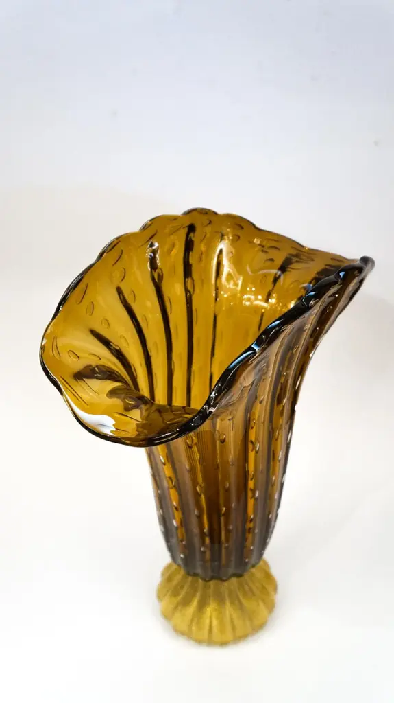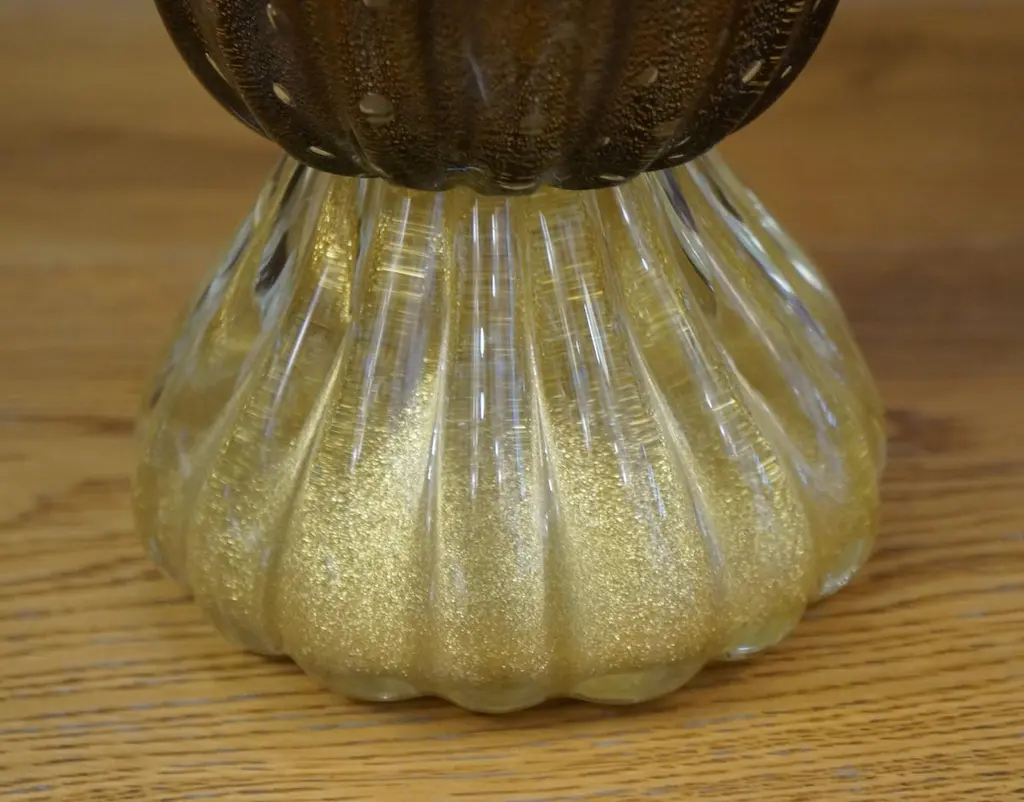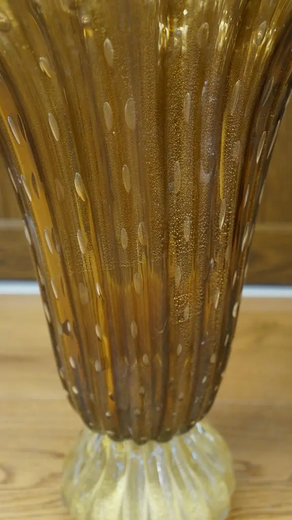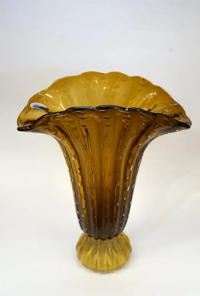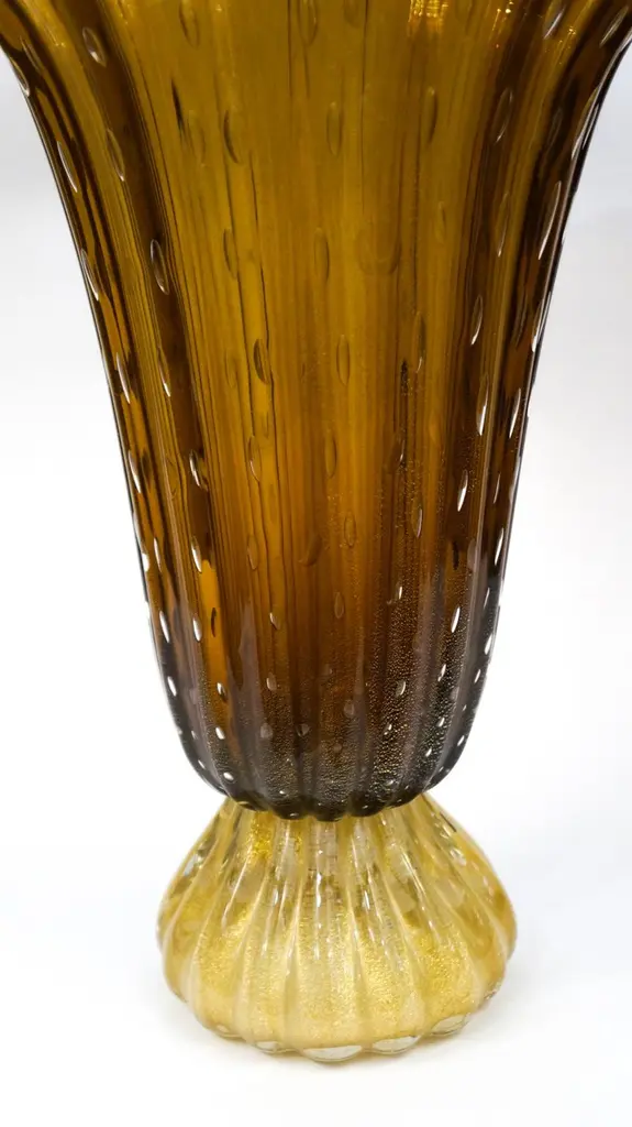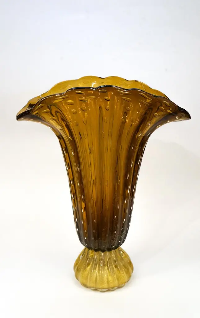 Designed in 1987 by Toso Murano, these vases are classic but rather elegant. They will give a touch of class to your room.Tobacco color with 24-karat gold leaf decoration and internal bubbles. Project by Toso Murano in 1987sVases signed with engraving: Toso MuranoAn original Murano glass vase represents the symbol of an art and a millenarian work, it represents the unique and indistinguishable state of a work of art made especially for you, only for you, because each piece is unique, as handmade by expert Venetian masters, which embody the art of centuries.The price of the item includes professional and tailored packing.