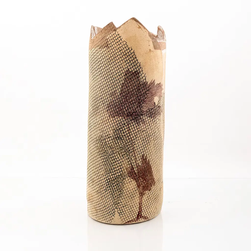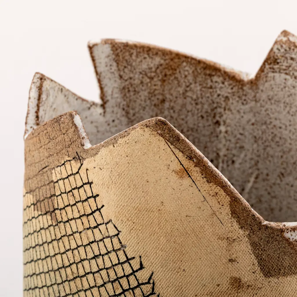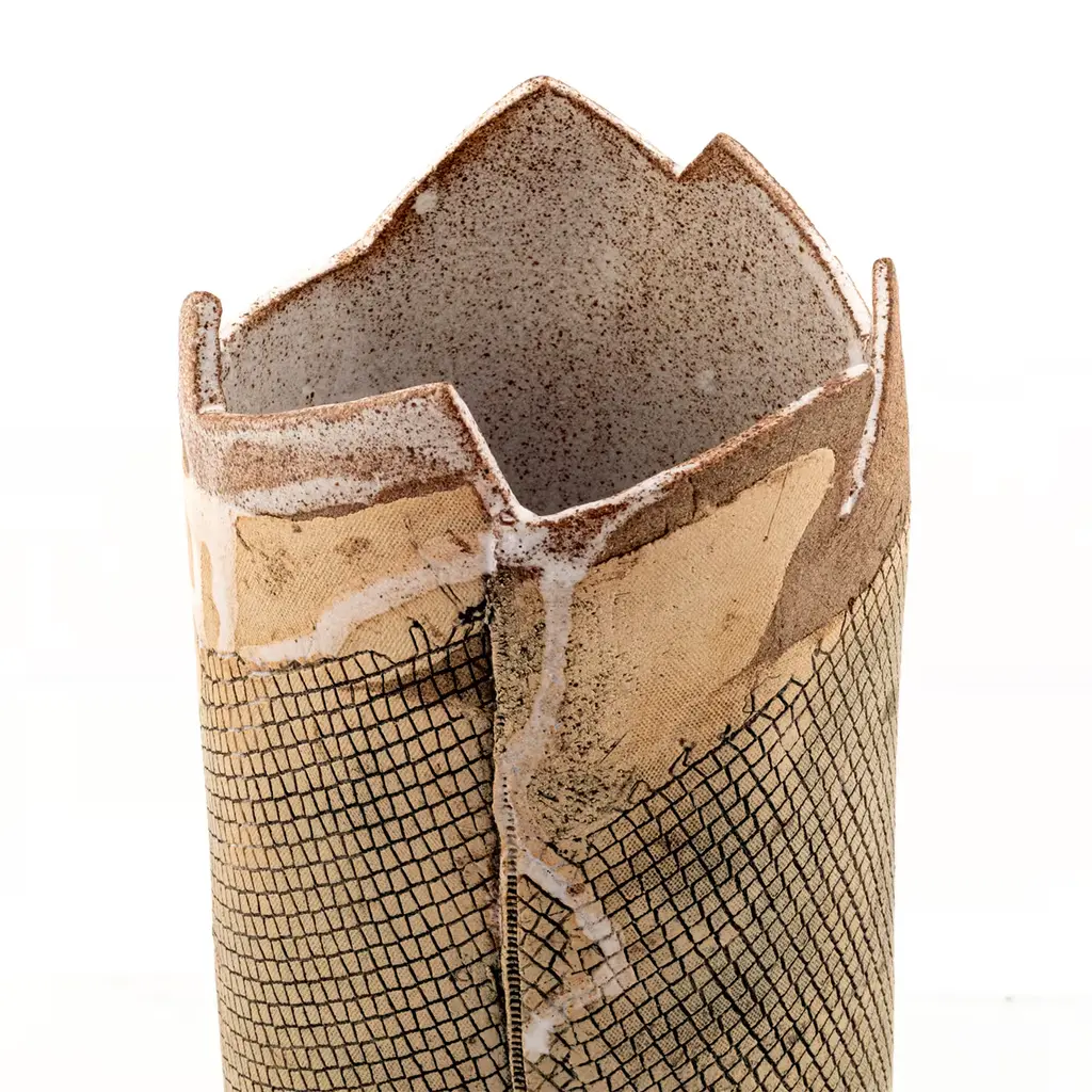 Deliberate discordances coexist in unexpected harmony in this singular hand-molded beige-and-gray vase, obtained from the combination of two different stoneware types. Polylines trace the mouth, its daring look matched by the contrasting ferrous reticular decal adorning the transparent satin outer surface. The interior flaunts a bright matte white glaze, completing the piece.