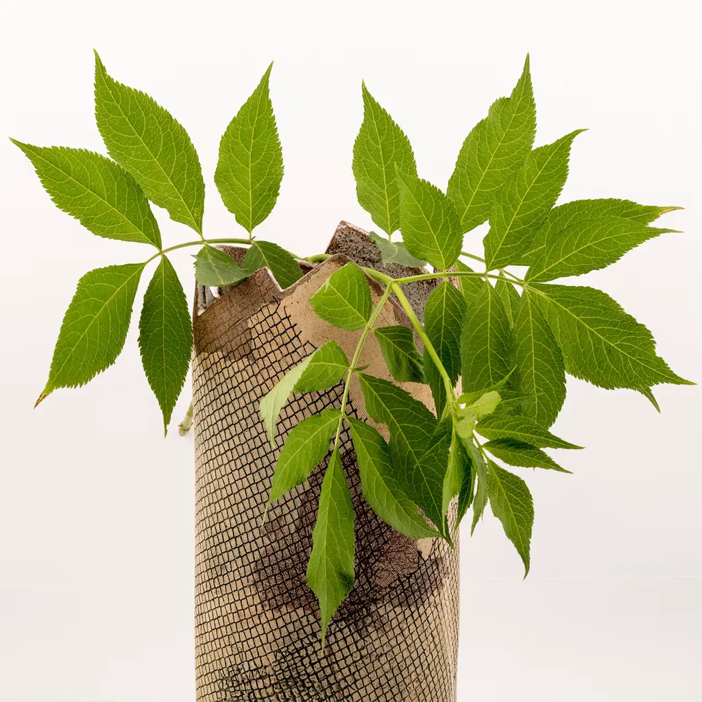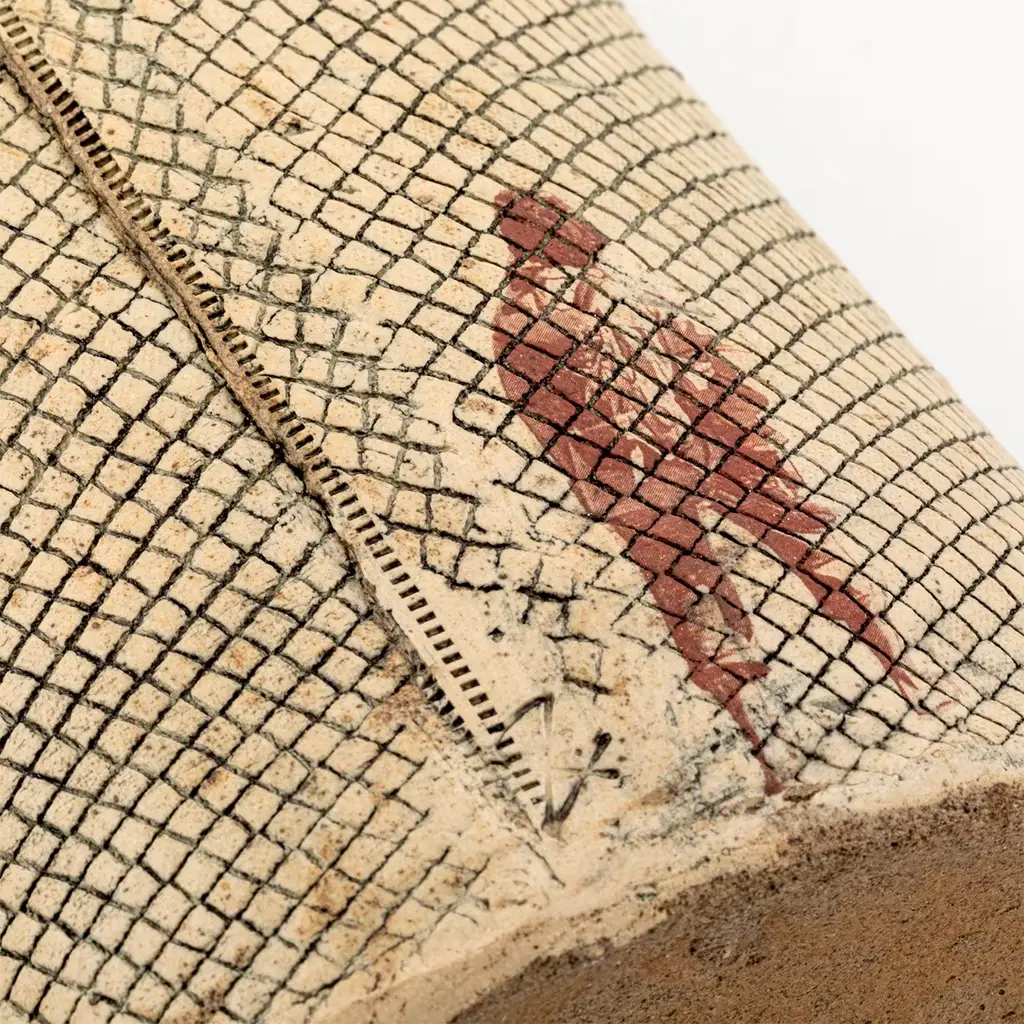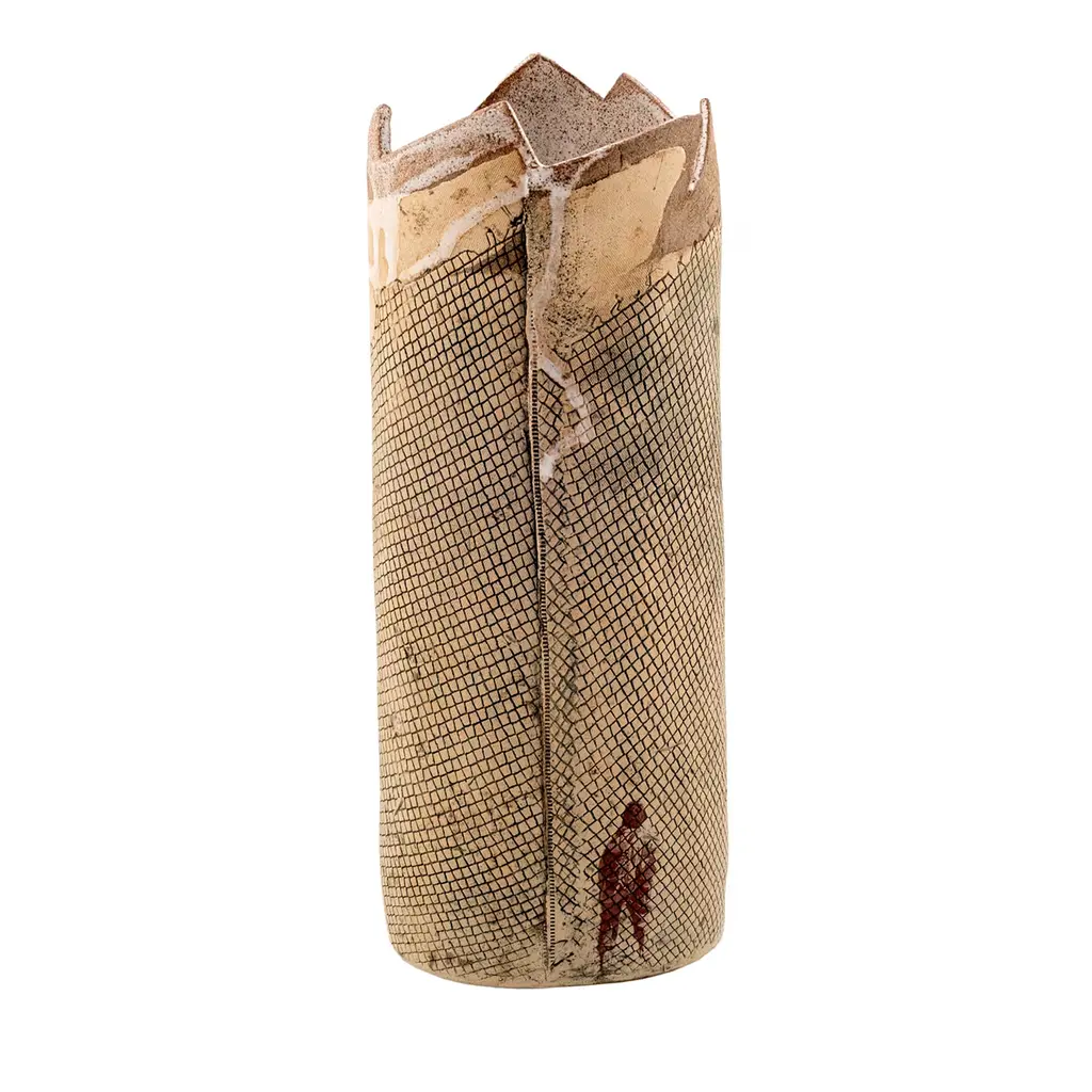 Deliberate discordances coexist in unexpected harmony in this singular hand-molded beige-and-gray vase, obtained from the combination of two different stoneware types. Polylines trace the mouth, its daring look matched by the contrasting ferrous reticular decal adorning the transparent satin outer surface. The interior flaunts a bright matte white glaze, completing the piece.