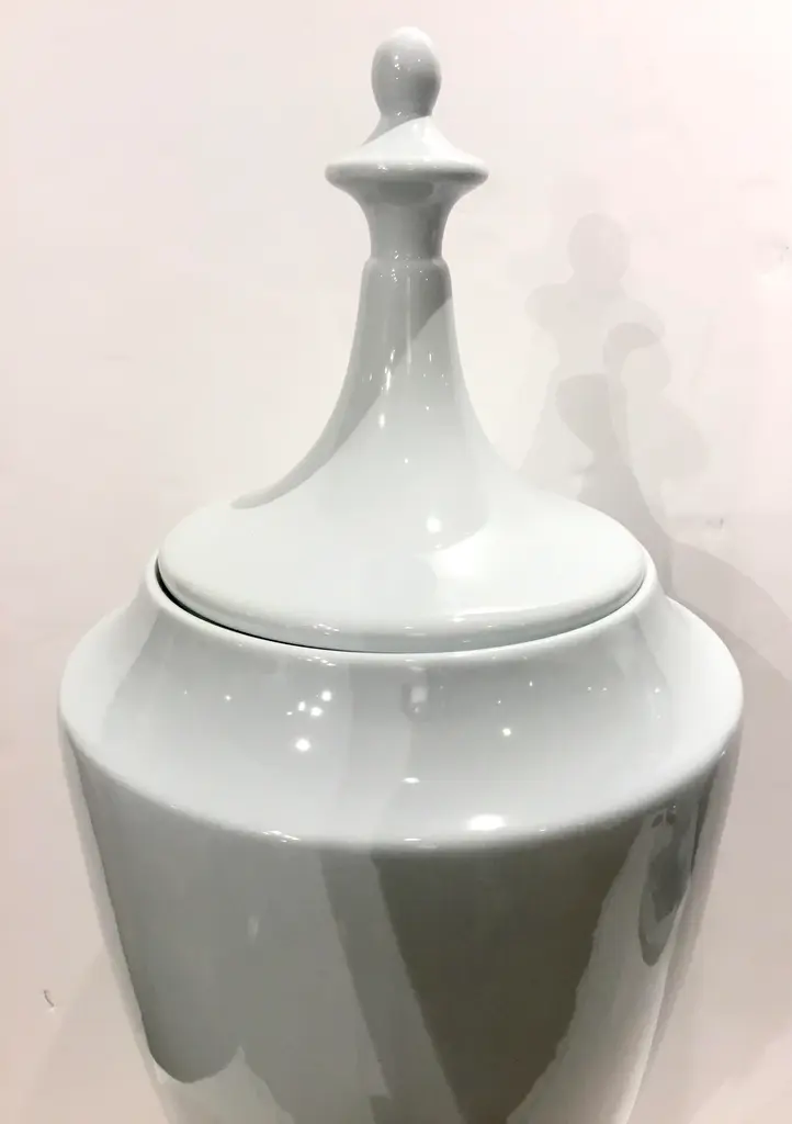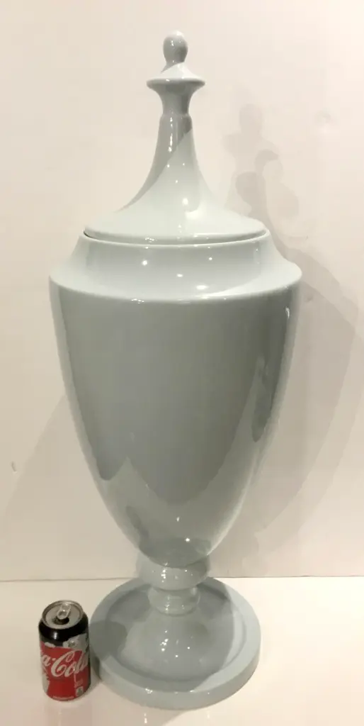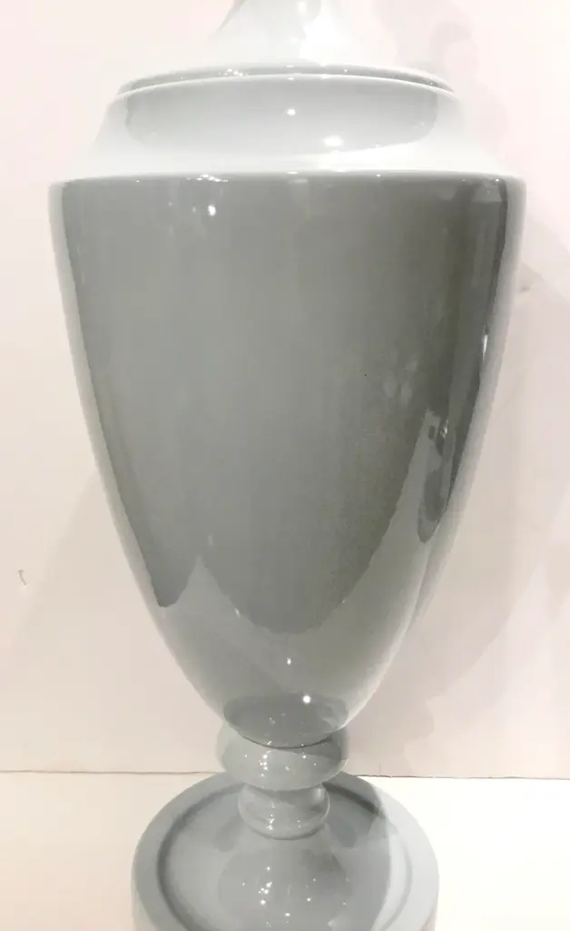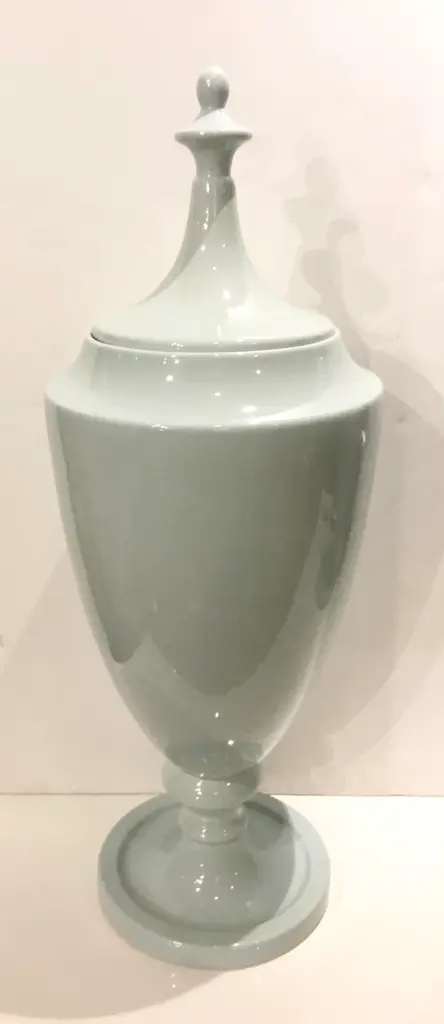 Stylish Transitional Grand Chalk Blue Glaze Ceramic Urn with Lid, showroom floor sample