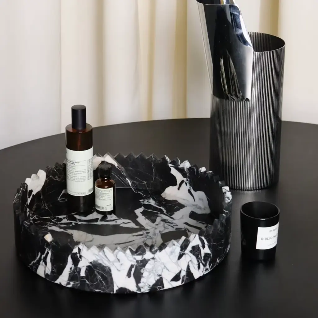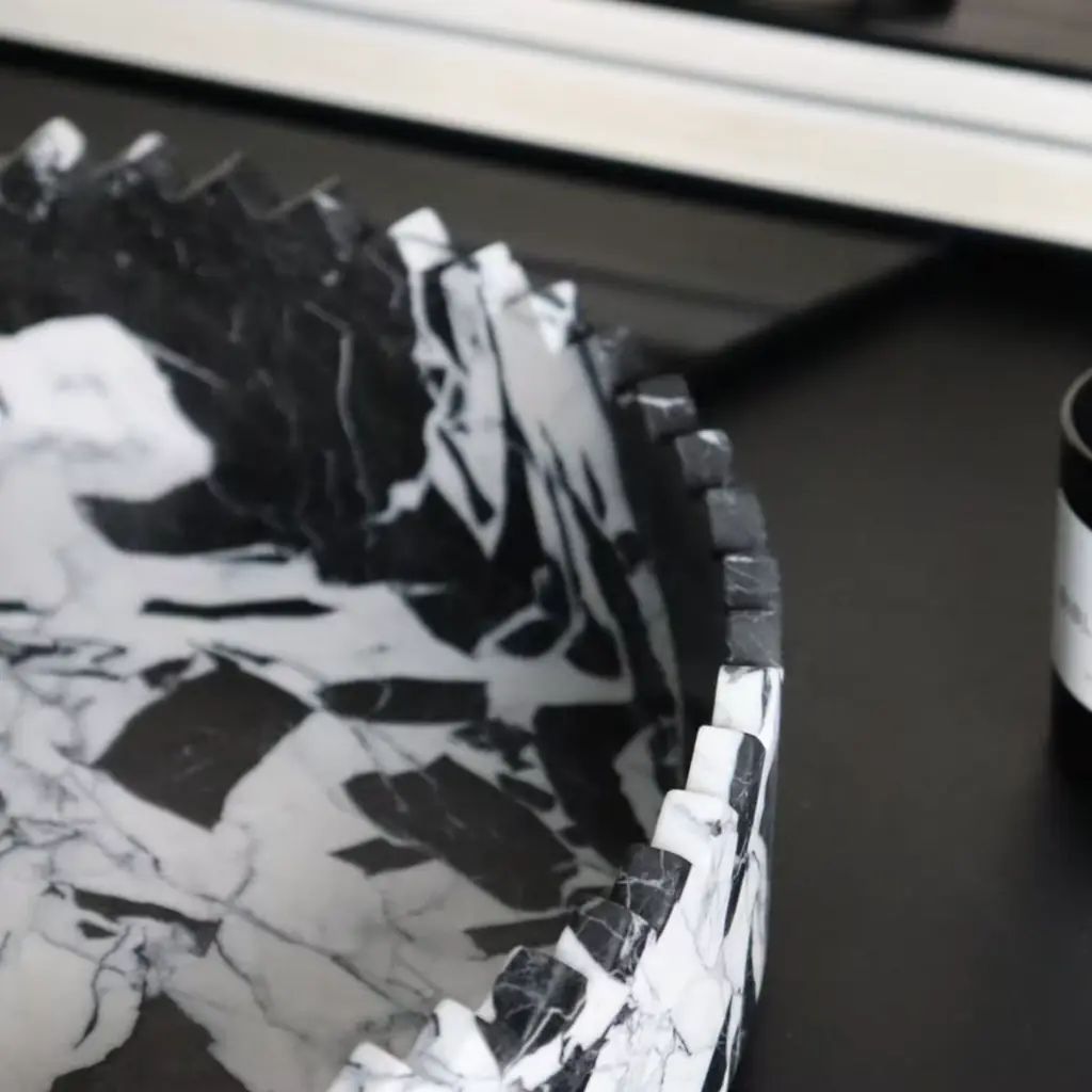 An enthralling composition of essential forms and bold colors, this eccentric black vase will be an eye-catching accent in a modern monochromatic entryway, living room, or kitchen. Crafted of prized Grand Antique marble, the dynamic surface is marked by a striking array of white, gray, and black marbling and veining, the organic lines and forms elegantly contrasting with the geometric, jagged raised rim. Designed by artist duo David/Nicolas, this piece will complement any tableware collection.