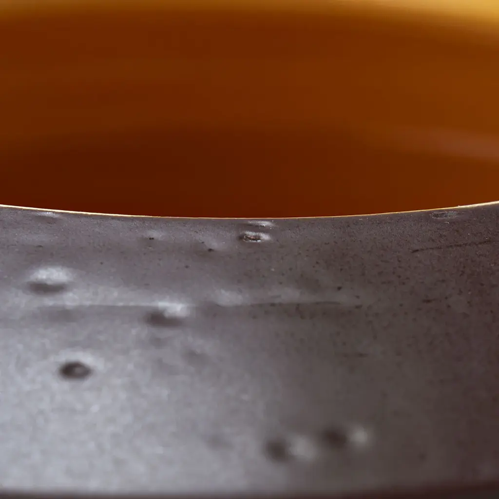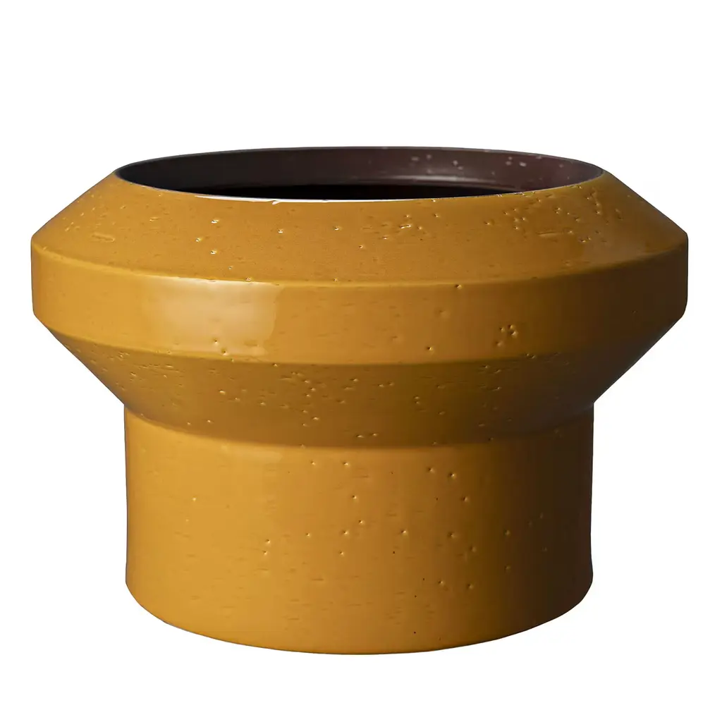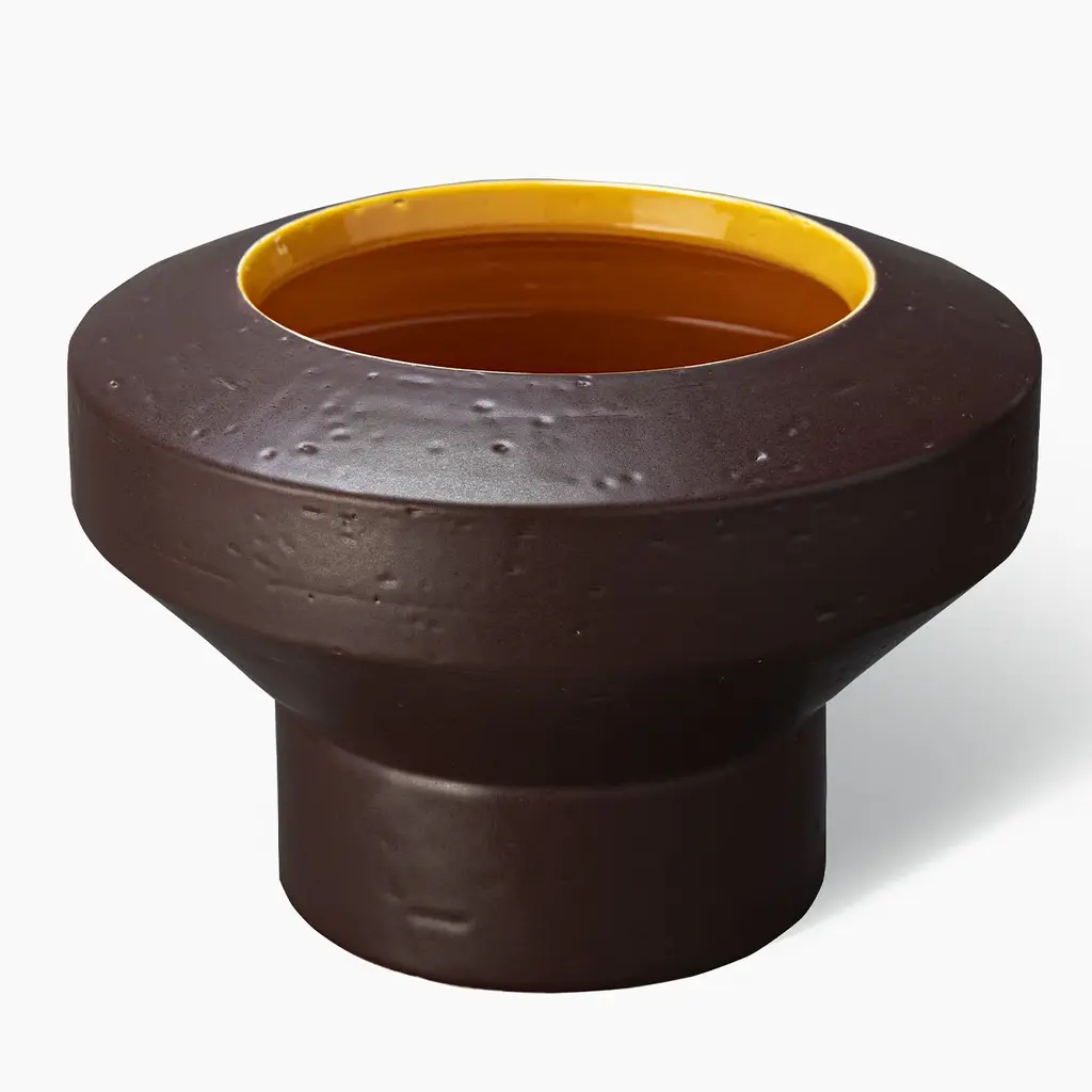 Rigorous yet harmonious, this charming ceramic vase displays a captivating two-tone enamel, yellow on the inside and brown on the outside. The cylindrical silhouette offers a dynamic interplay of volumes, resulting in a thinner base and a larger upper section surrounding the circular mouth. This piece was showcased at the 2019 Milan Design Week.