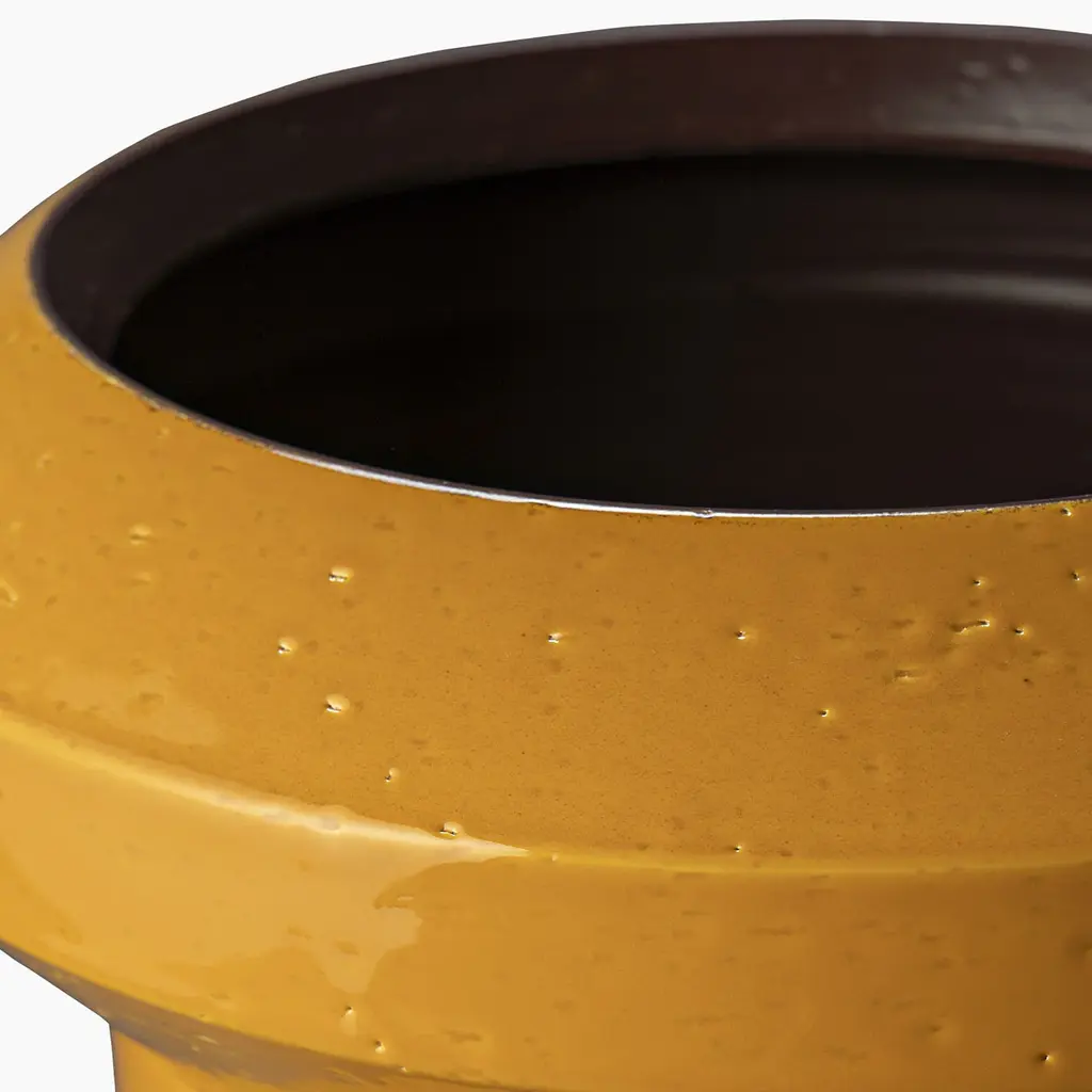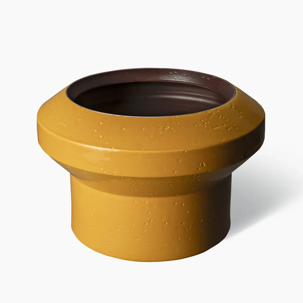 Conveying a joyful yet rigorous flair, this ceramic vase is characterized by sharp, geometric lines and a two-tone finish in warm hues: yellow on the outside and brown on the inside. Its spacious silhouette rests on a cylindrical footed base and displays a wide neck visibly tapered towards the mouth. This piece from the Tribe Collection by Arik Levy was showcased at the 2019 Milan Design Week.