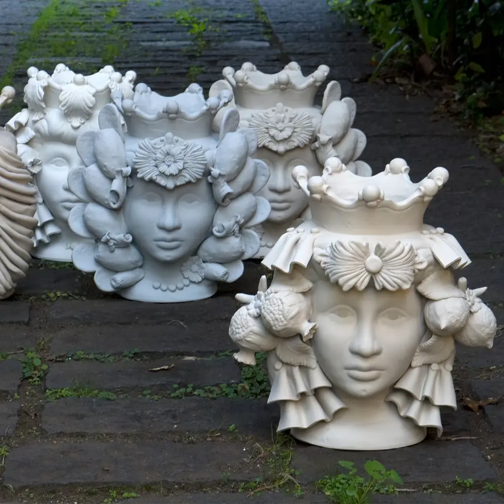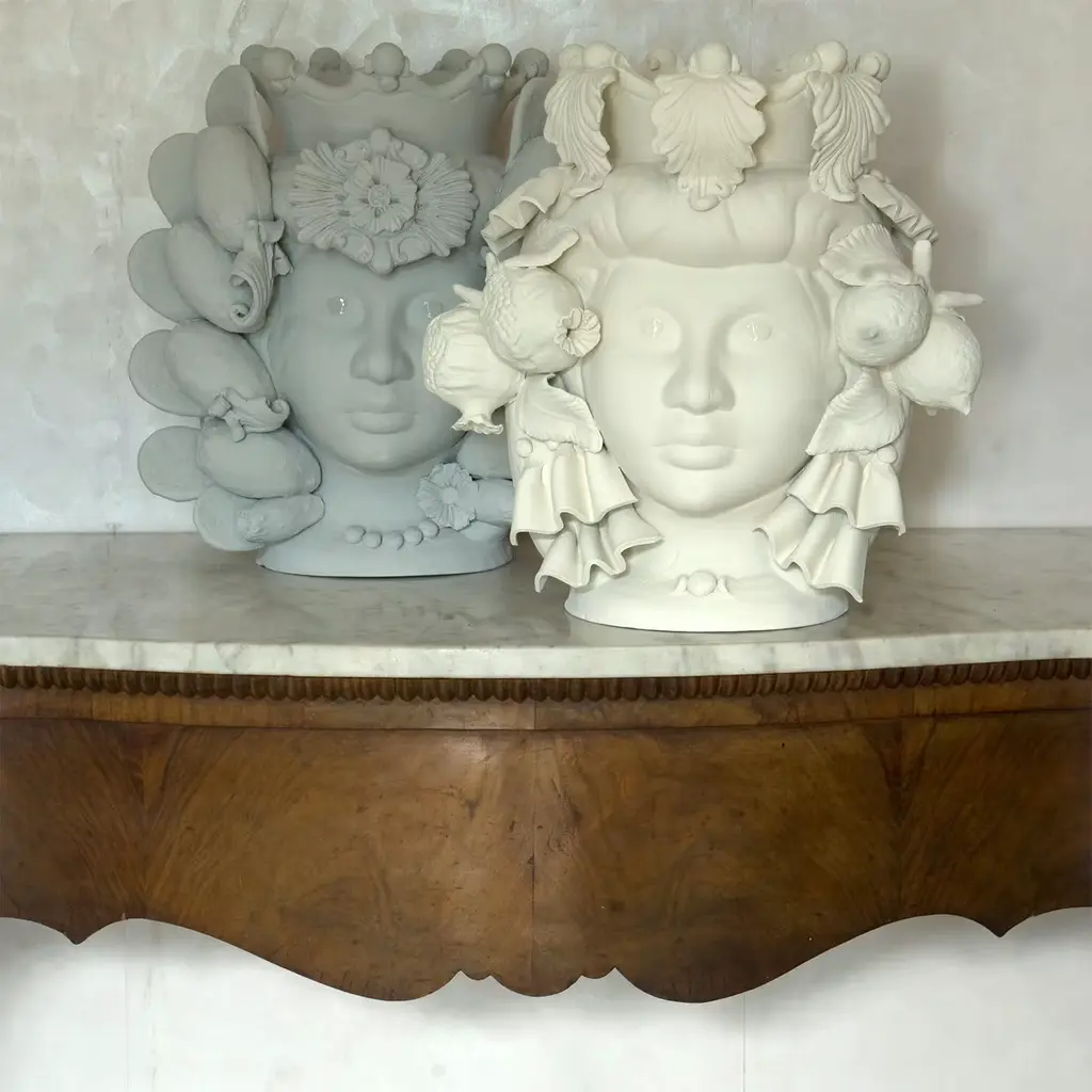 This anthropomorphic vase is made entirely by hand and painted in a matte ivory monochrome tint, rich in natural pigments and resin binders that provide intense color depth. Only the eyes are glazed so they stand out, emphasizing the beauty of the gaze. The piece is inspired by ancient Sicilian legends of love and revenge between a Moor and a Maiden. The vase cannot be filled with water.