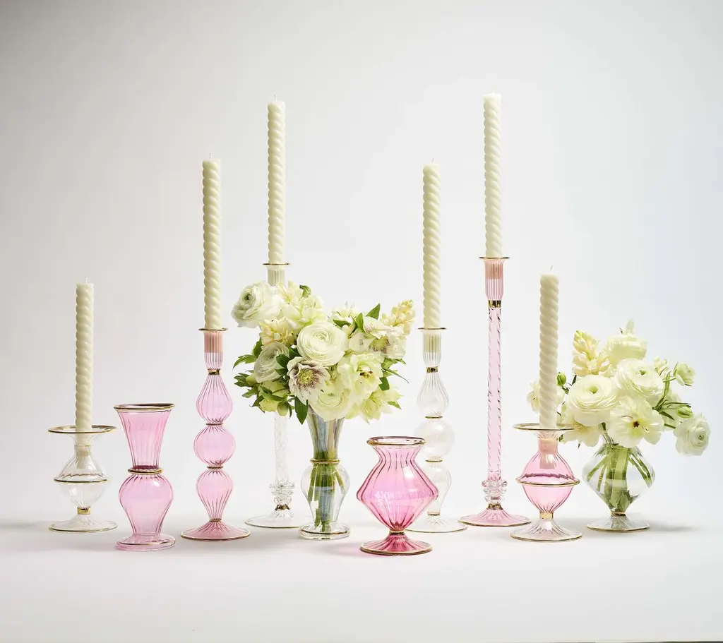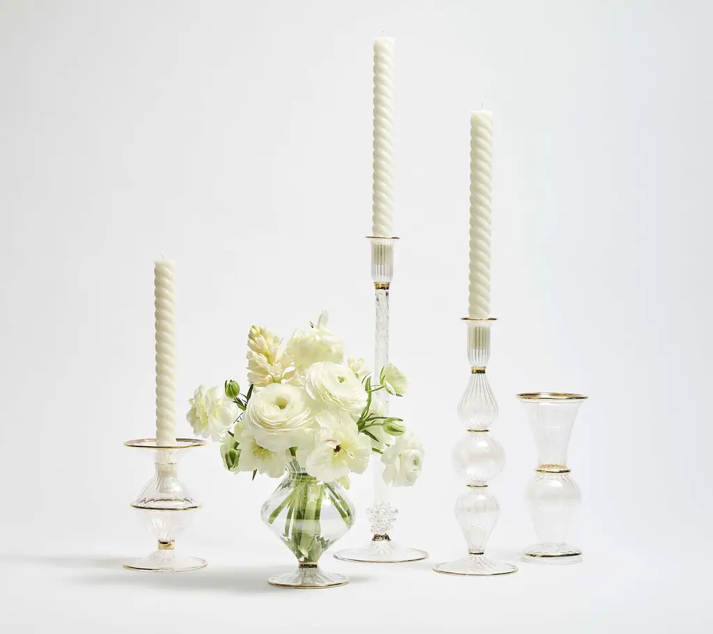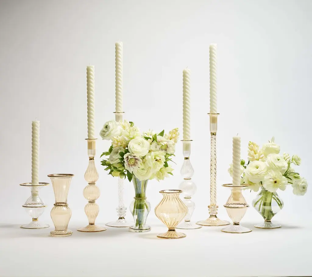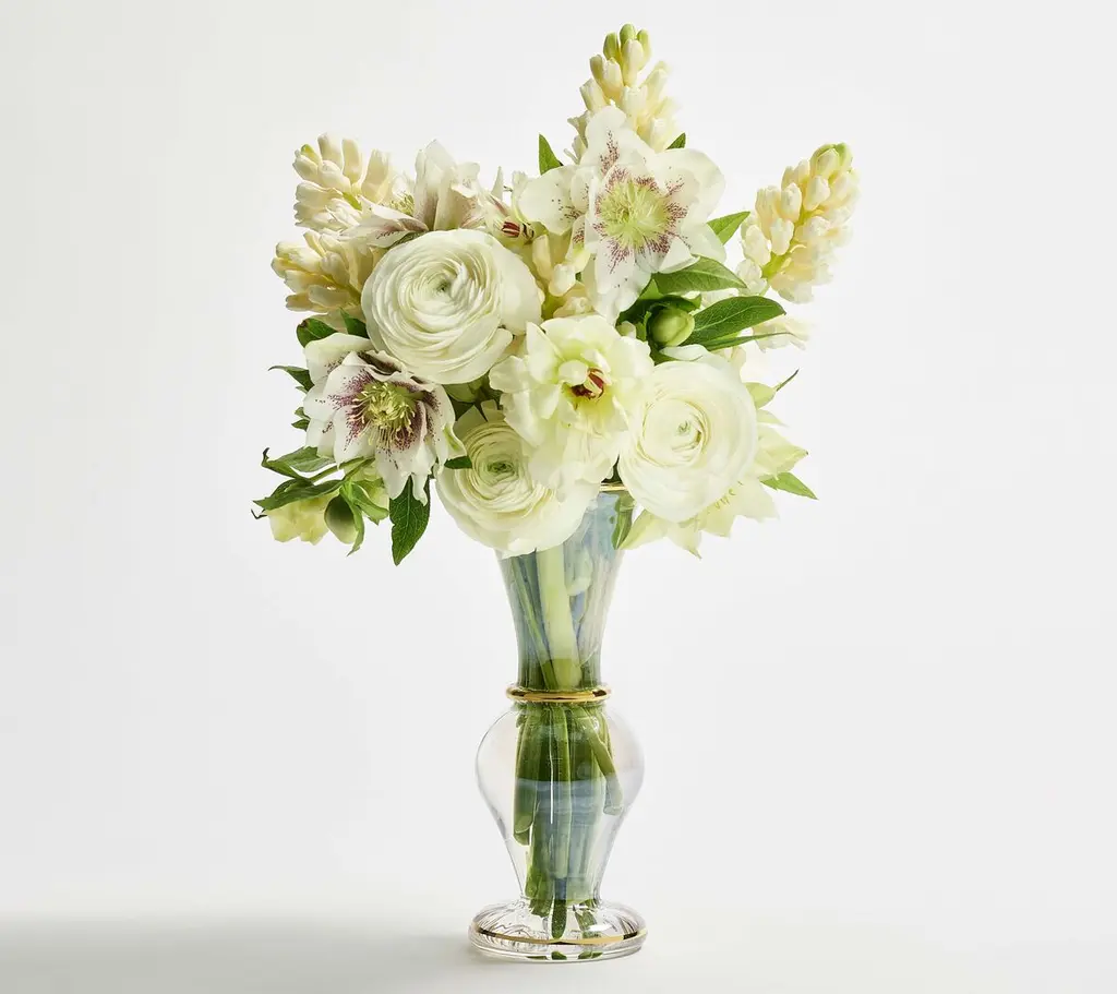 The mouth-blown, hand-molded glass Trumpet Bud Vase features an elongated trumpet flute atop a globe-like base. Hand-applied color baked at high temperatures produces a stunning iridescent luster. 18K gold bands accent the rim, center and base of this contemporary take on a trumpet vase. Expect shape, size and color variation due to their hand-crafted nature.