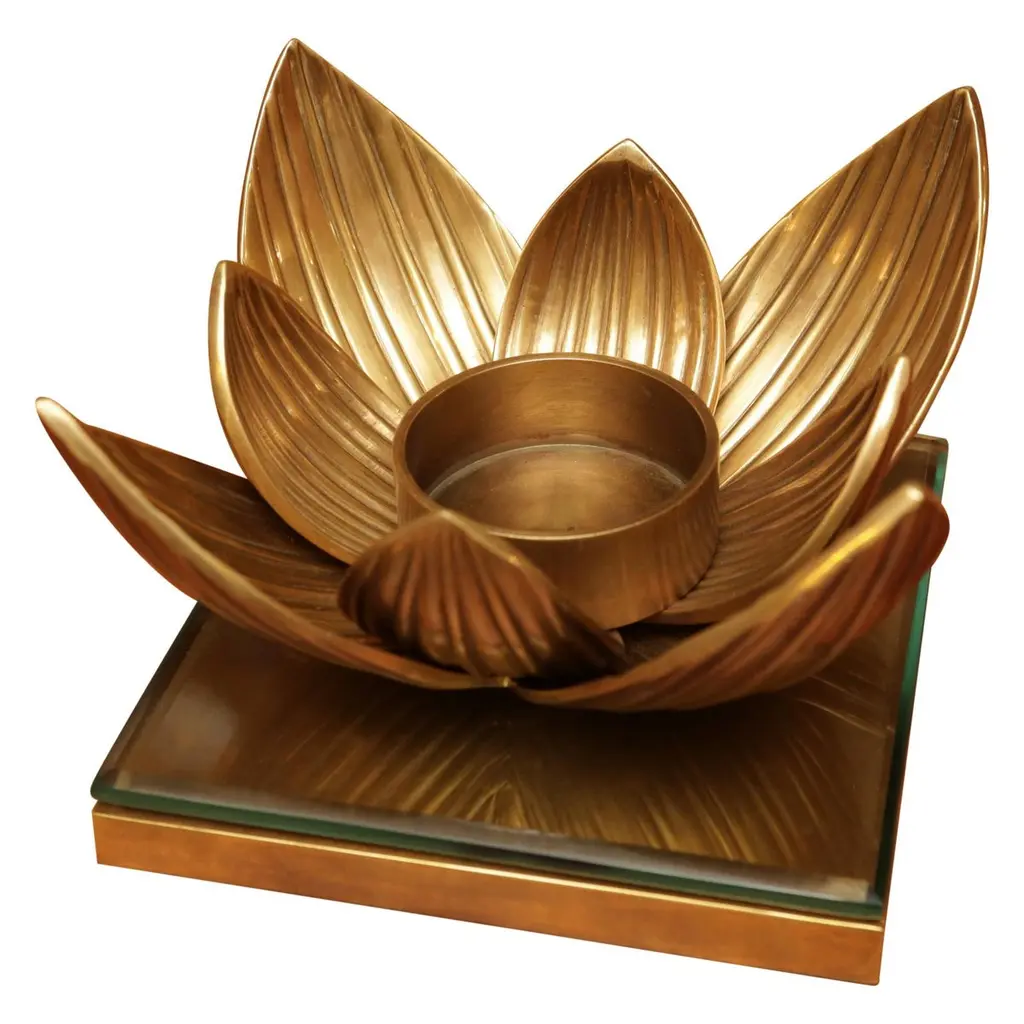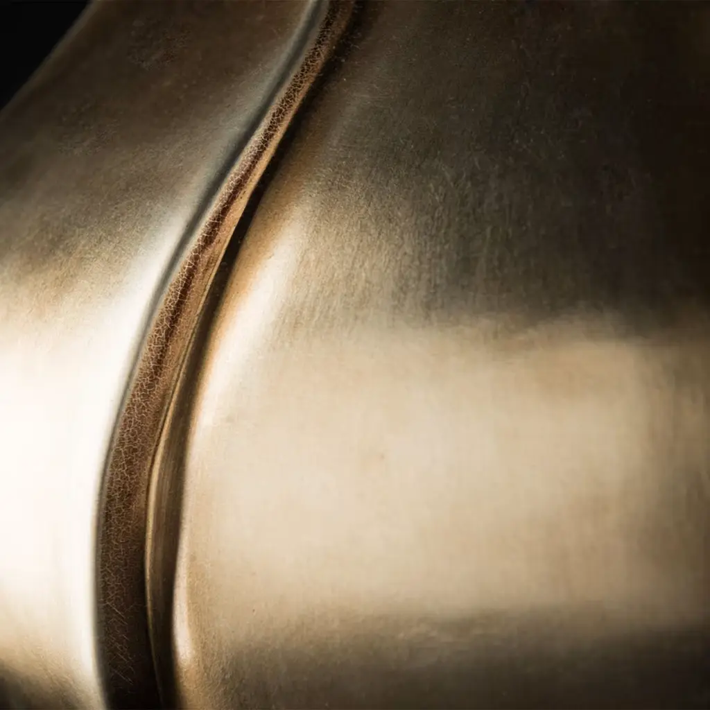 Elegant tones of gold stand out when looking at this precious piece of craftsmanship. Entirely made by hand, this decorative vase is fashioned of ceramic, finished with a metallic brass glaze, and boasts the sinuous silhouette of a tulip's bud slightly opening towards the top. A statement piece by itself, it can also be displayed with the tall version for a striking visual effect.