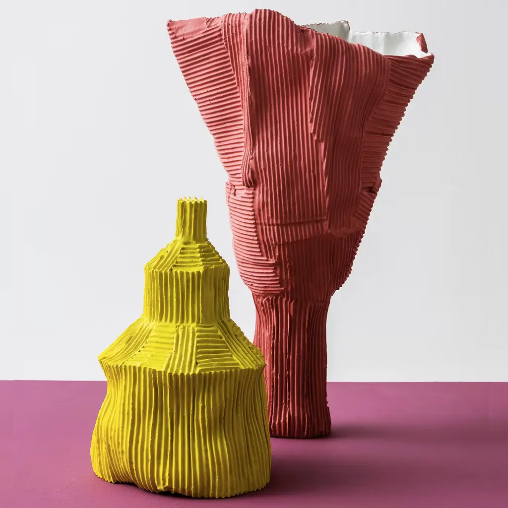 Merging modern design with innovative artistic sensibility, this vase is a daring exercise in balance and visual harmony. Fashioned by artist Paola Paronetto using her signature paper clay (combination of paper pulp, natural fibers and clay), the vase’s silhouette flares out from a tall sturdy base to form a dramatic, flower-like shape evoking a tulip in full bloom. The vibrant coral surface is enhanced by expressive horizontal and vertical ridges, creating a captivating tactile quality. Every one of Paola Paronetto’s creations is unique. Slight variations in shape, colour and size are to be considered a guarantee of authenticity and value. They are finished with non-toxic satin-finish enamels. Although very rarely, it is possible for them to leak after long periods of exposure to water. It is therefore advisable to test their water resistance before using them on delicate surfaces. They should not be used as dining utensils. The white pieces can be washed with water or sanitizing products, whereas the coloured pieces must be treated more gently and cleaned with a feather duster or a soft cloth, dry or moistened very slightly with water.