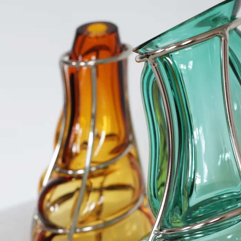 Using ancient metalworking and glassworking techniques, each Babà vase is crafted with precision, becoming an artistic jewel for home decor. The artist meticulously bends and welds metal, reviving the "ingabbiato" technique. Collaborating with Murano artisans, Alice honors Italian heritage with vases inspired by human forms, celebrating individuality. 'Slight variations may apply in the replica due to a handmade production process. Each artifact is unique: the height, the “fullness,” the cut, and the color shading depends on the exact moment the glass is blown inside the metal cage by the Master glassmaker. Metal finish: nickel plated. Mouth: Ø8cm.