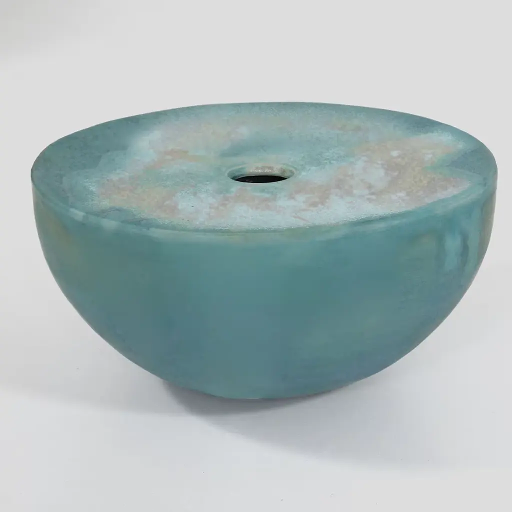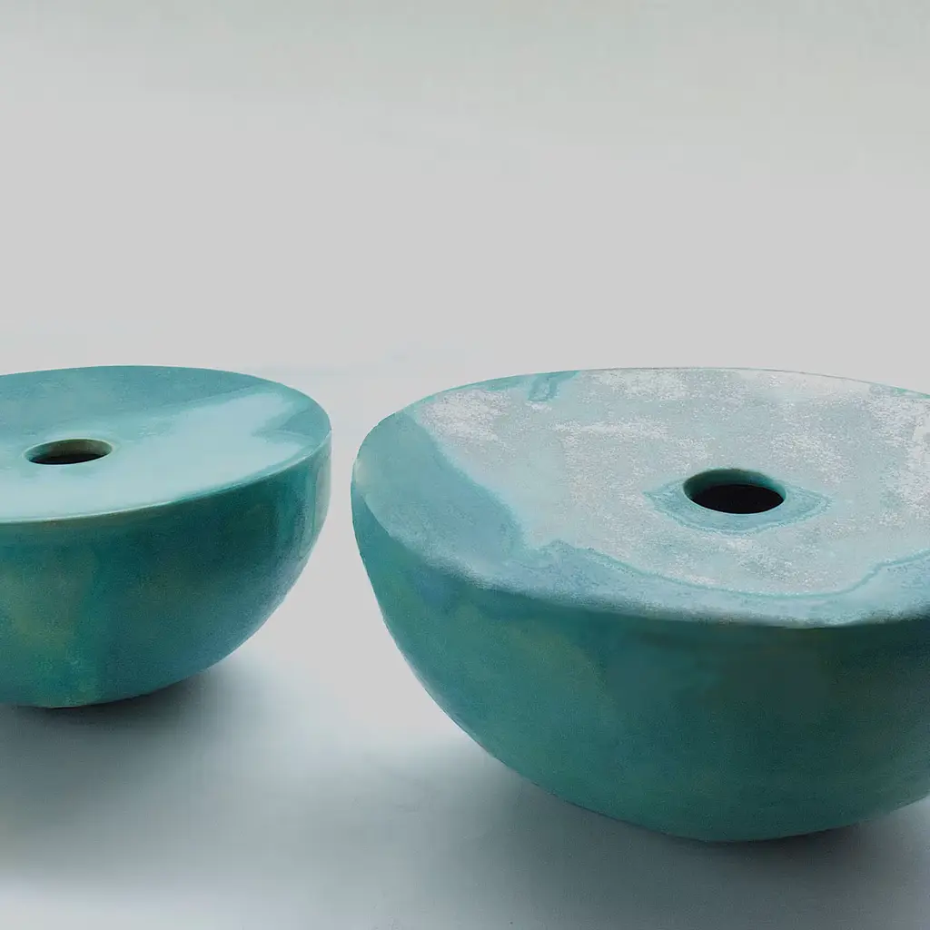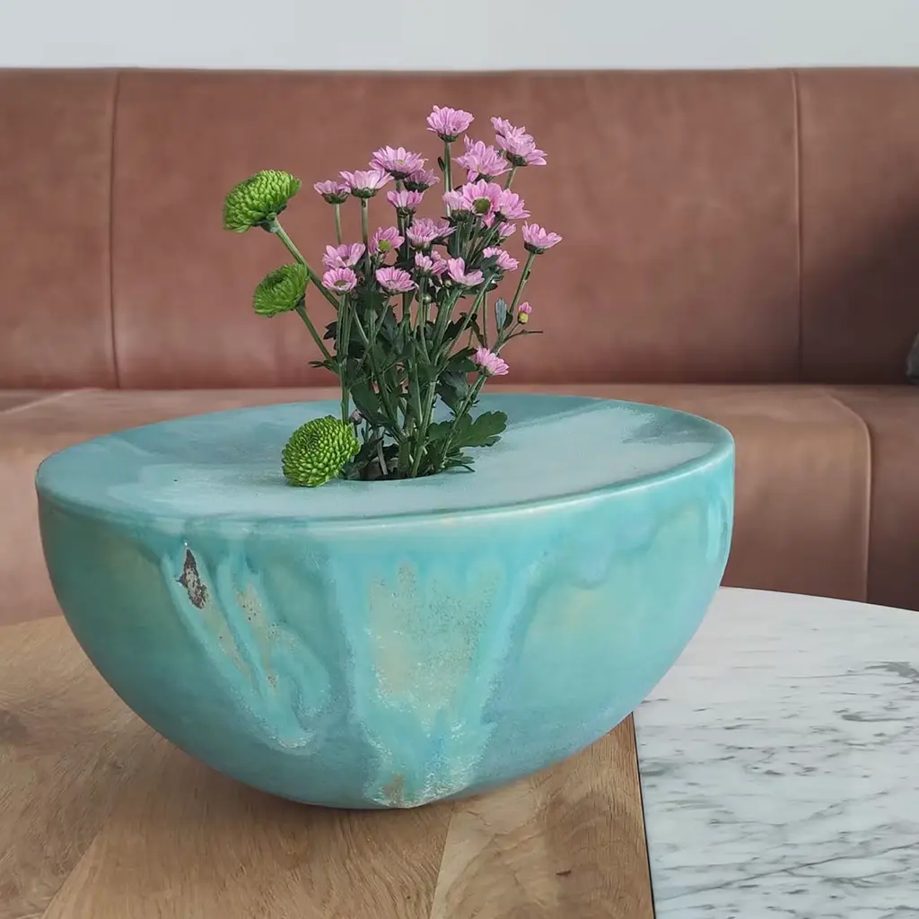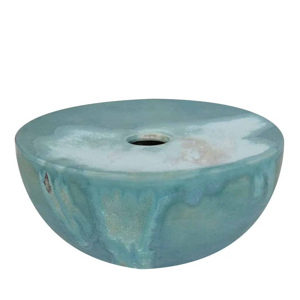 The Nebulae Vase Collection was born from the suggestions of Cosmo’s mysteries. Depending on the thickness of the splash and the background color, unexpected stain shapes, and textures arise. In the deep Turquoise vase, the nebula goes from a suffused sky blue to golden sparks. The contrast between the small opening and the large width of the semi-globe makes these vases sculptural objects, donating allure to your home décor.