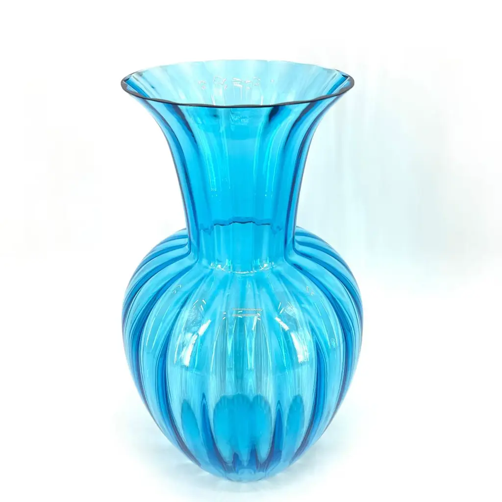 This elegant Murano glass vase features a captivating turquoise hue. The rigadin technique adds depth and charm to its design, while its slim and sophisticated shape blends expert craftsmanship with modern style. A true work of art, it’s perfect for adding a touch of elegance to any space. Comes with a certificate of authenticity.