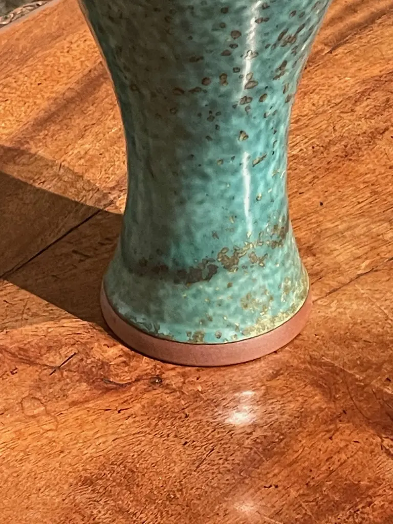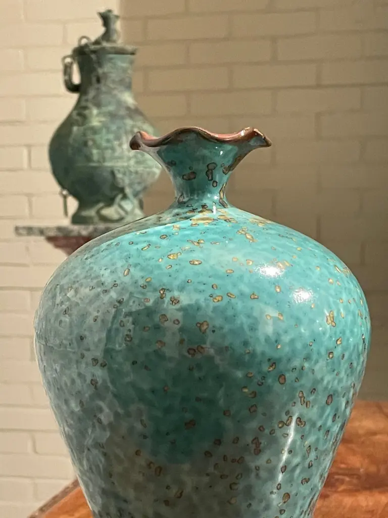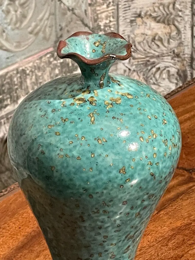 Contemporary Chinese turquoise with gold speckled glaze vase.Classic shape with scalloped design spout opening.Two available and sold individually.One of several pieces from a large collection.
