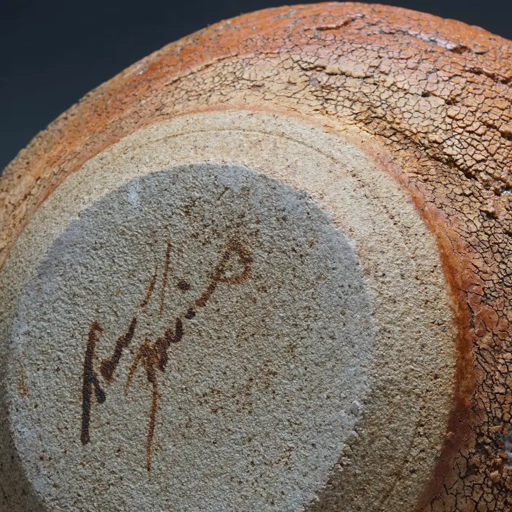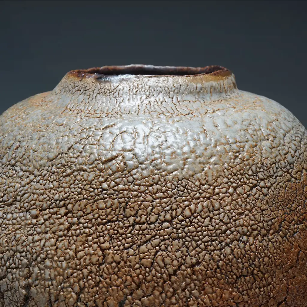 This stoneware vase showcases a distinctive textured surface, achieved through the application of a traditional Shino glaze. Fired at 1300°C using reduction techniques, it is water-sealed and suitable for holding flowers. Its rounded, organic shape and earthy tones add a rustic yet refined touch to any home décor setting. Each piece is unique, and due to handcrafting, slight changes may occur.