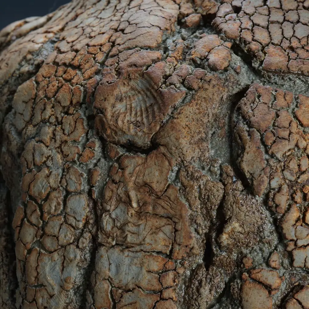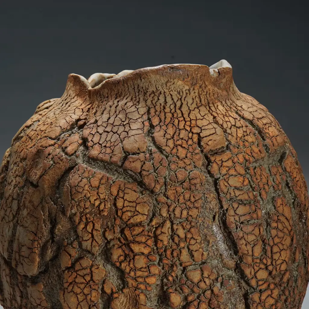 This decorative vase features a heavily textured surface that mimics the intricate patterns of seed pods. Created using a high-temperature reduction firing process at 1300°C, the vase is sealed for water resistance, making it suitable for holding flowers. Its distinct earthy brown tones and organic form add a natural, tactile element to any interior setting. Each piece is unique, and due to handcrafting, slight changes may occur.