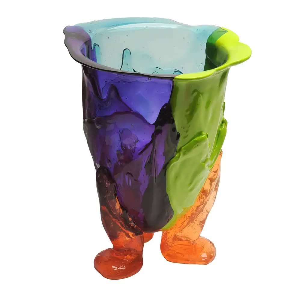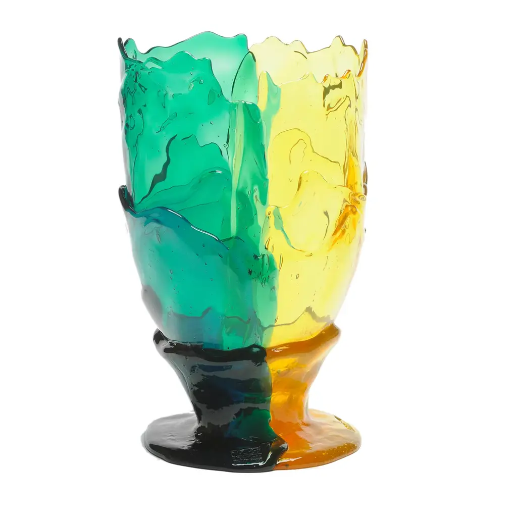 The ultimate statement piece in any home, both on its own or with flowers, this vase features dripping layers of vibrant green- and yellow-colored resin in a goblet shape. The soft resin is sculpted into layers to create an evocative visual effect that will brighten a room or office in both modern and classic decors. Designed by Gaetano Pesce in 1995 for the Fish Design collection, this vase's color, nuance and texture are unique, fusing traditional craftsmanship with contemporary materials. Each piece is handmade so colors may differ slightly from the image shown.
