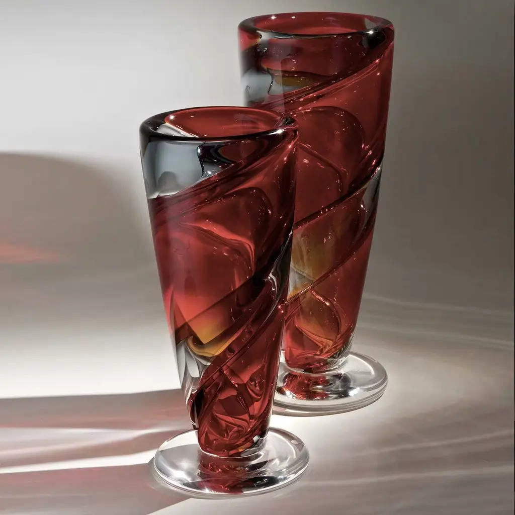 Part of the Twister Collection, this exceptional vase exemplifies modern design that exalts traditional craftsmanship. The flared vase silhouette is characterized by the thick bands of red and steel-colored glass swirling around to create a dynamic and highly textured statement piece. This piece is entirely handmade using ancient glassmaking methods that help reflect the light new and intriguing ways. This set is also available in orange/red and green/blue color combinations and in larger size (43 cm height).