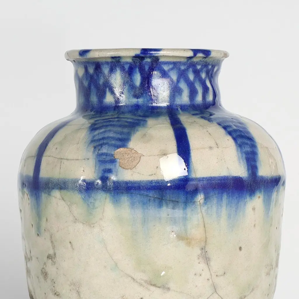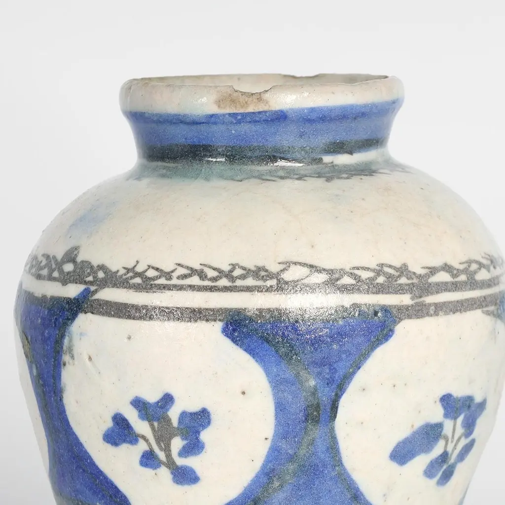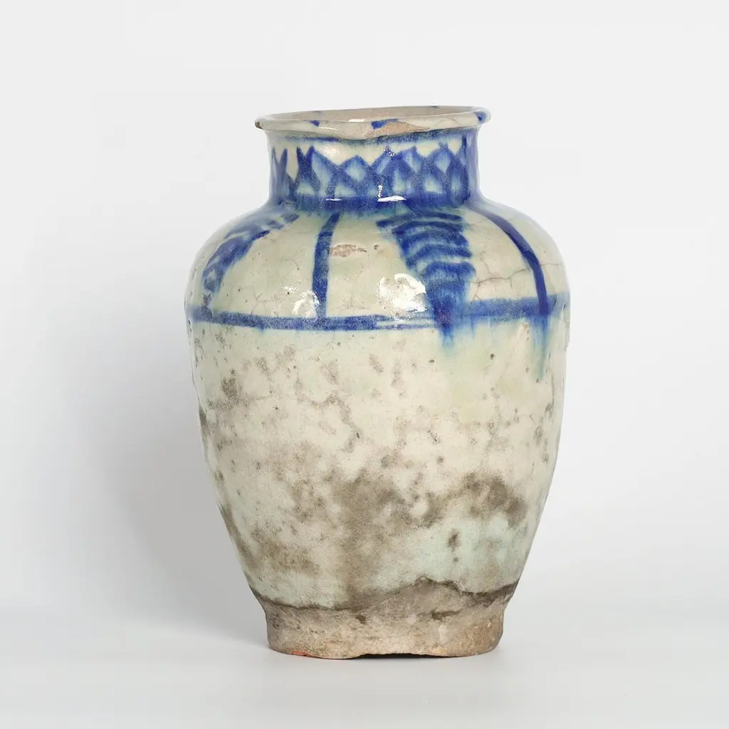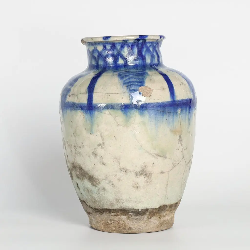 Impressive group of two 18th Century Persian vases handcrafted in terra cotta in classic form, hand decorated in blue and white under a thick glaze. Both pieces proudly displaying their charming aged patina. Left: H: 7.75 DM: 6 $1,000.00Right: H: 6.5 DM: 5 $800.00