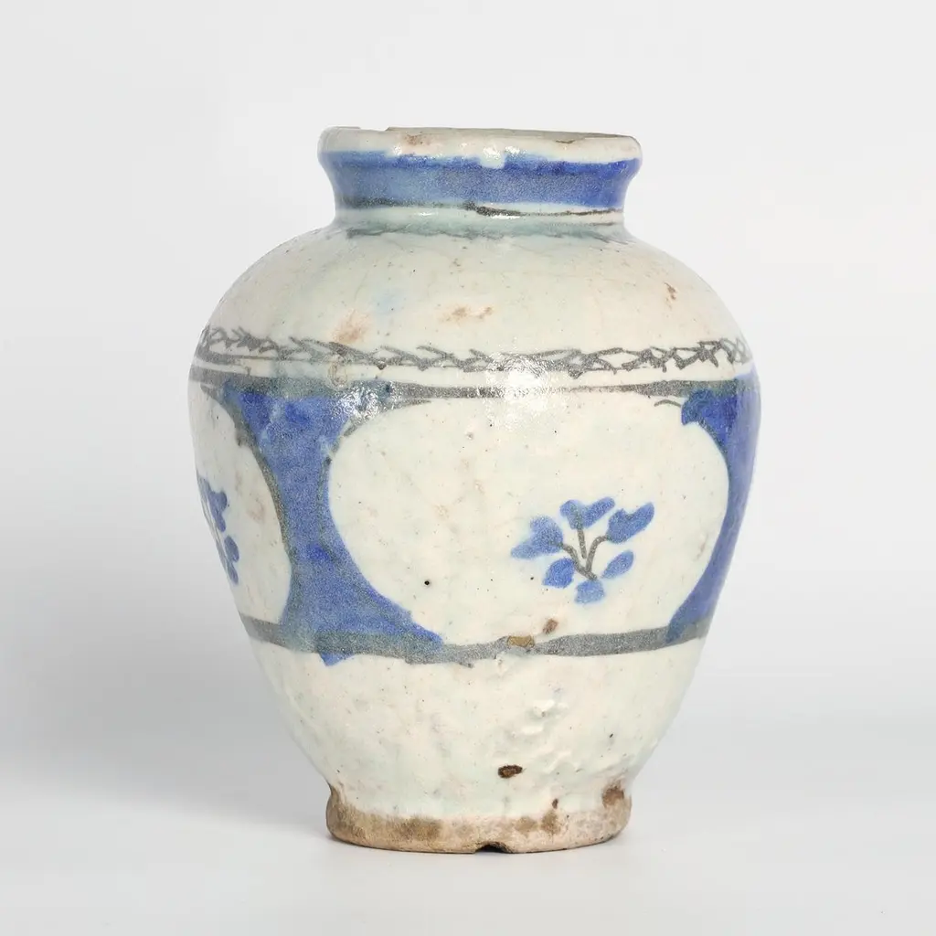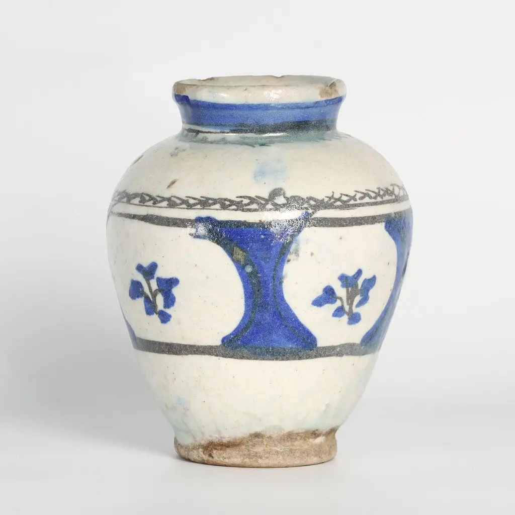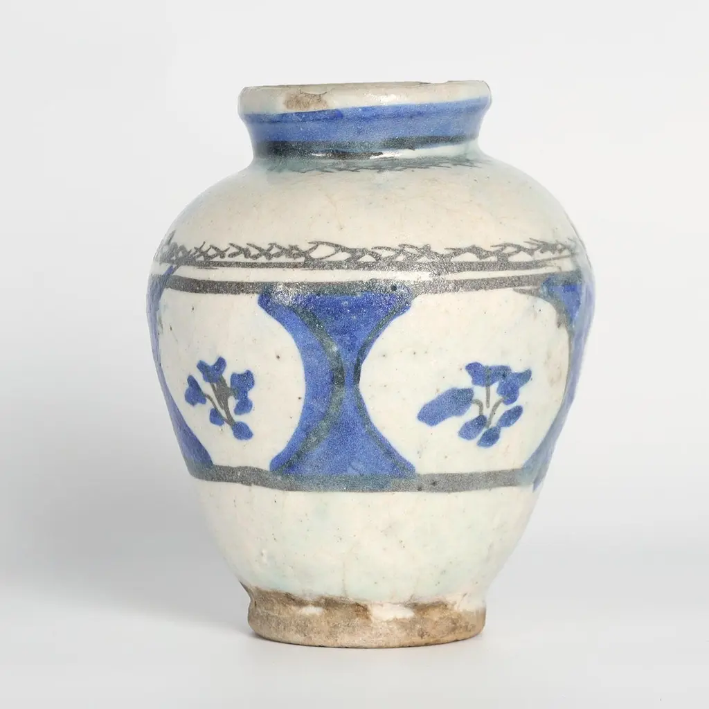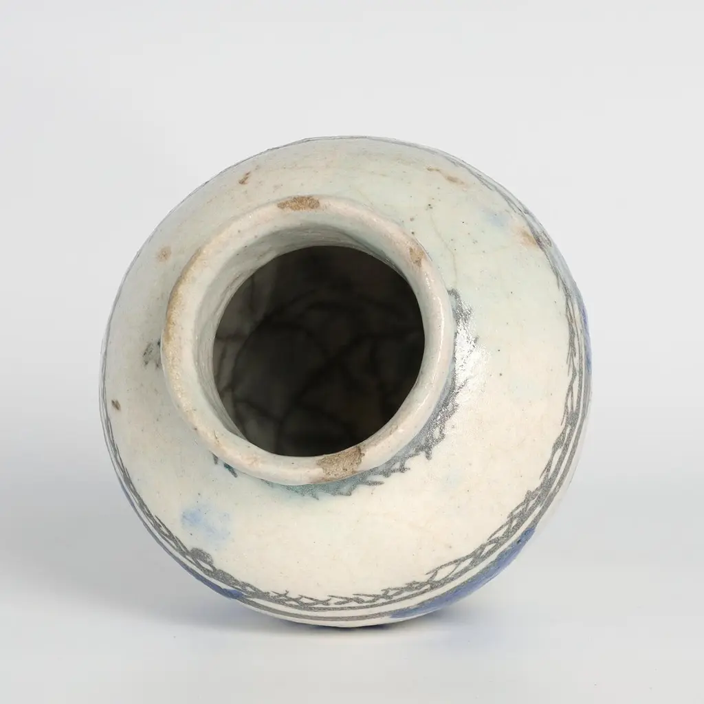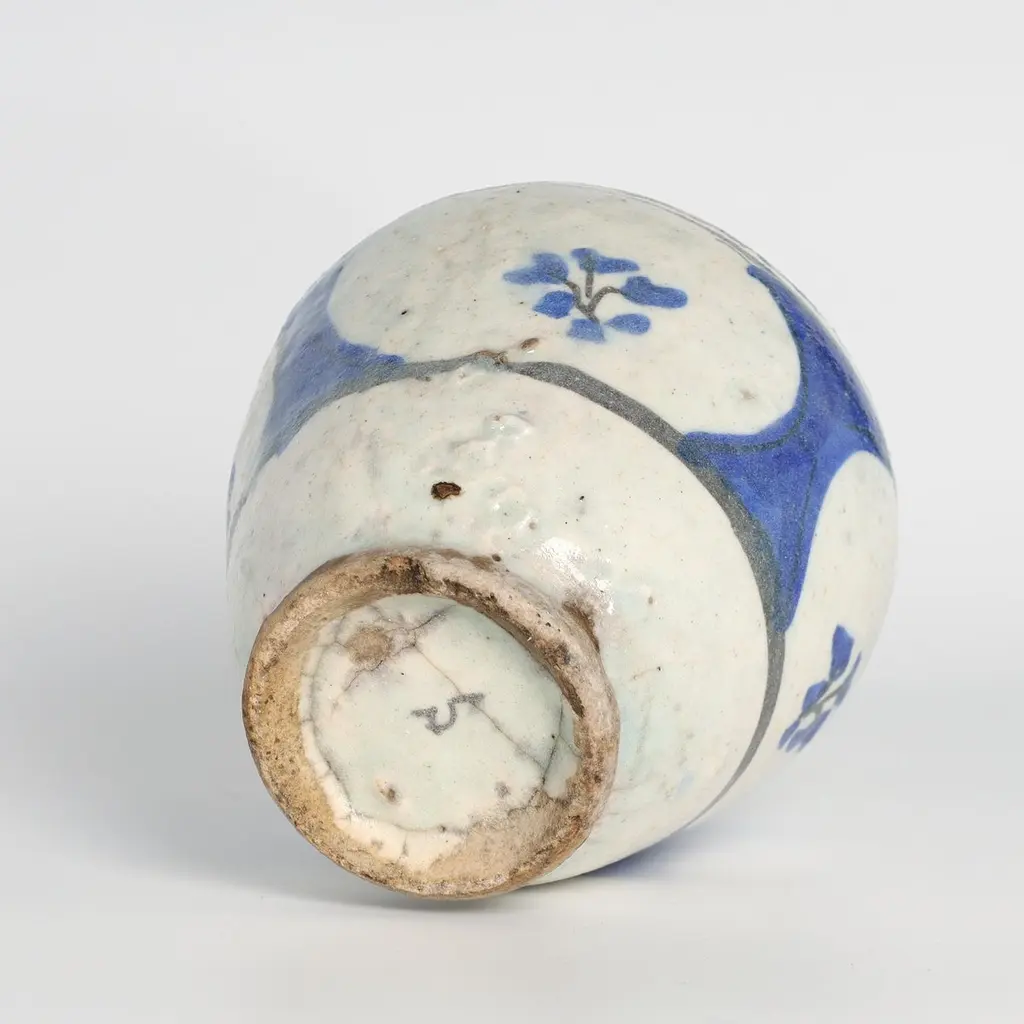 Impressive group of two 18th Century Persian vases handcrafted in terra cotta in classic form, hand decorated in blue and white under a thick glaze. Both pieces proudly displaying their charming aged patina. Left: H: 7.75 DM: 6 $1,000.00Right: H: 6.5 DM: 5 $800.00