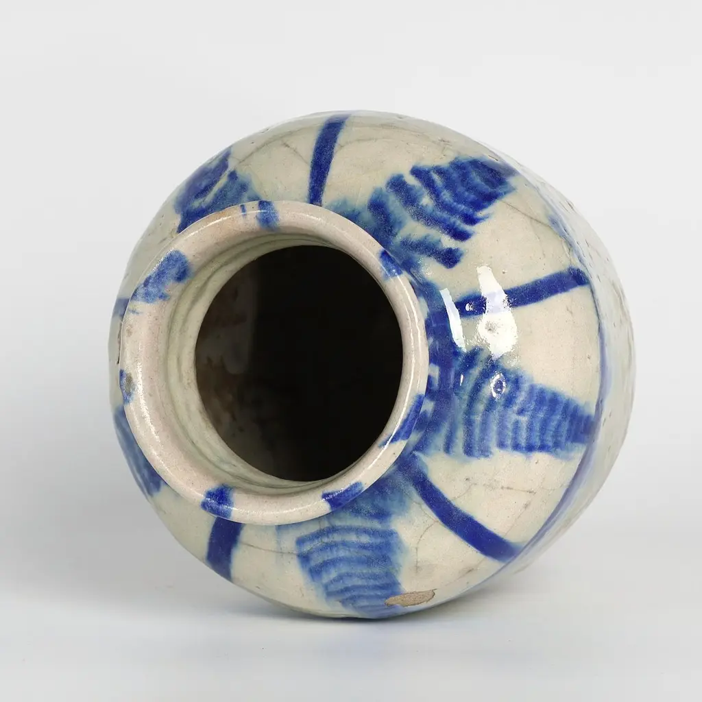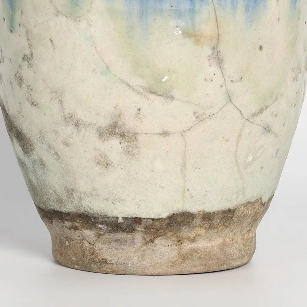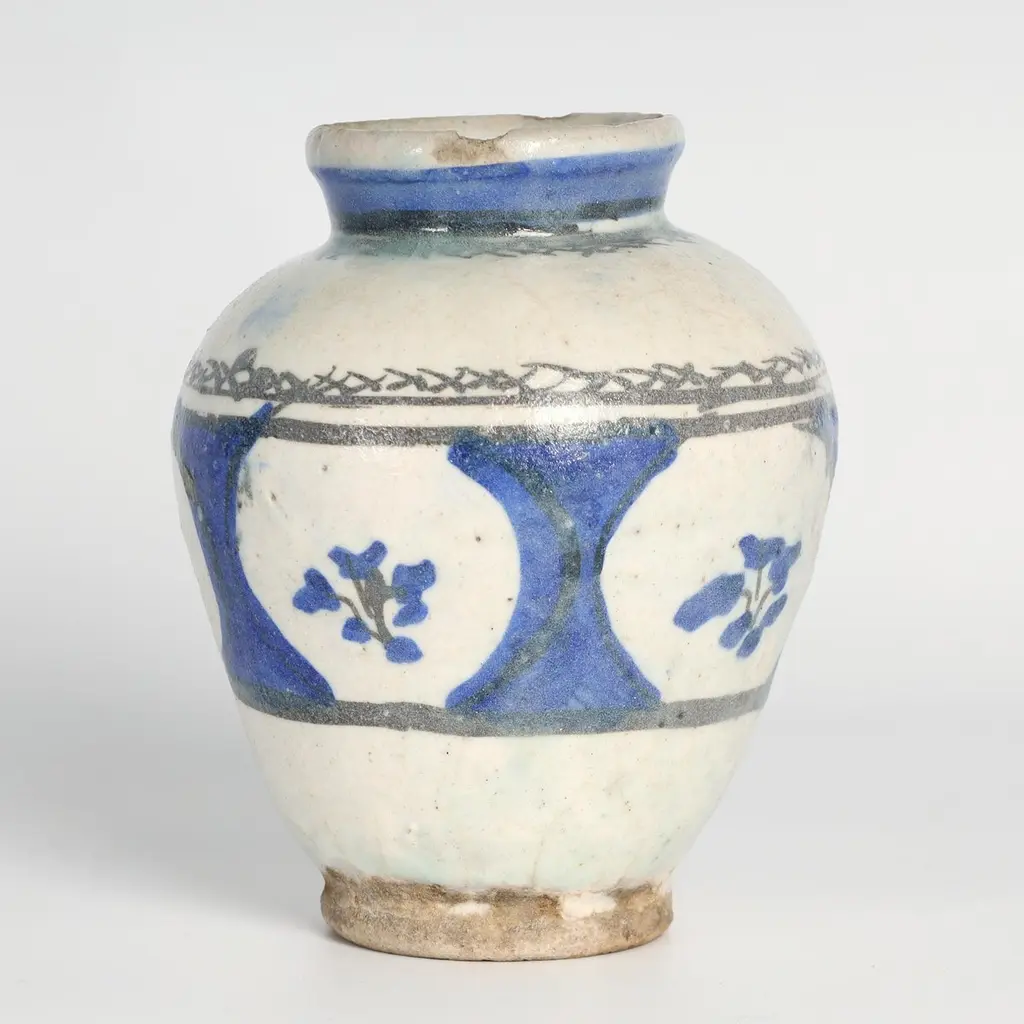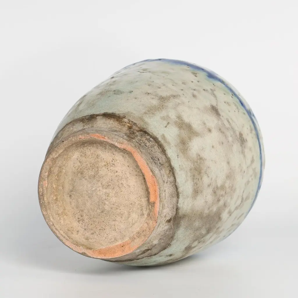 Impressive group of two 18th Century Persian vases handcrafted in terra cotta in classic form, hand decorated in blue and white under a thick glaze. Both pieces proudly displaying their charming aged patina. Left: H: 7.75 DM: 6 $1,000.00Right: H: 6.5 DM: 5 $800.00