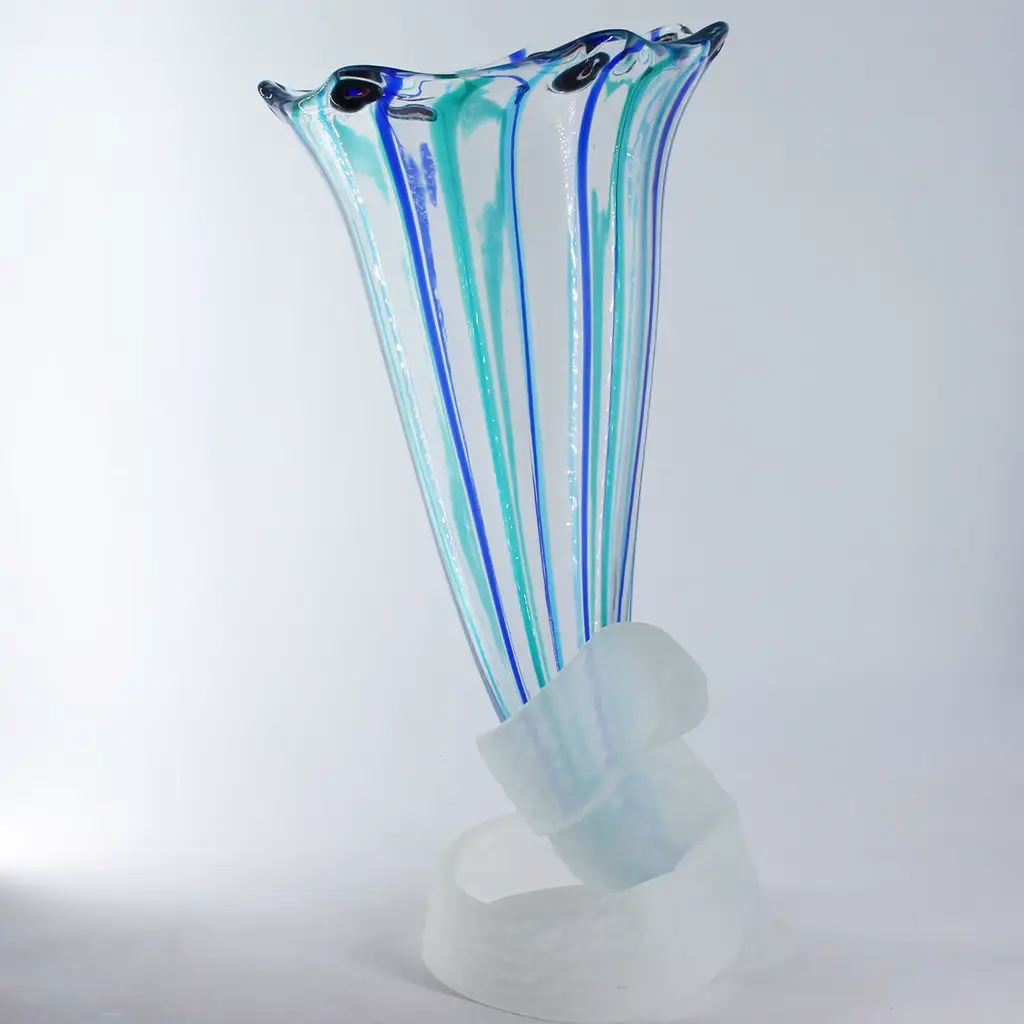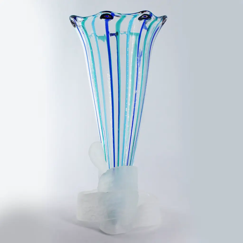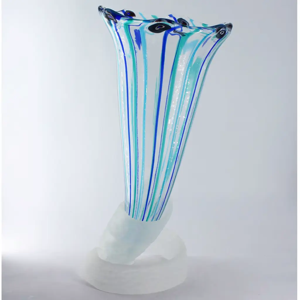 This grand cornucopia vase features a unique two-piece design that creates striking visual harmony. The set includes a transparent glass base and a delicately crafted vase that fits seamlessly into it. Handcrafted on Murano Island, it showcases intricate Murrine patterns and vibrant blue and aquamarine canes, reflecting exceptional artistry and vibrant elegance. A true statement piece for any space.