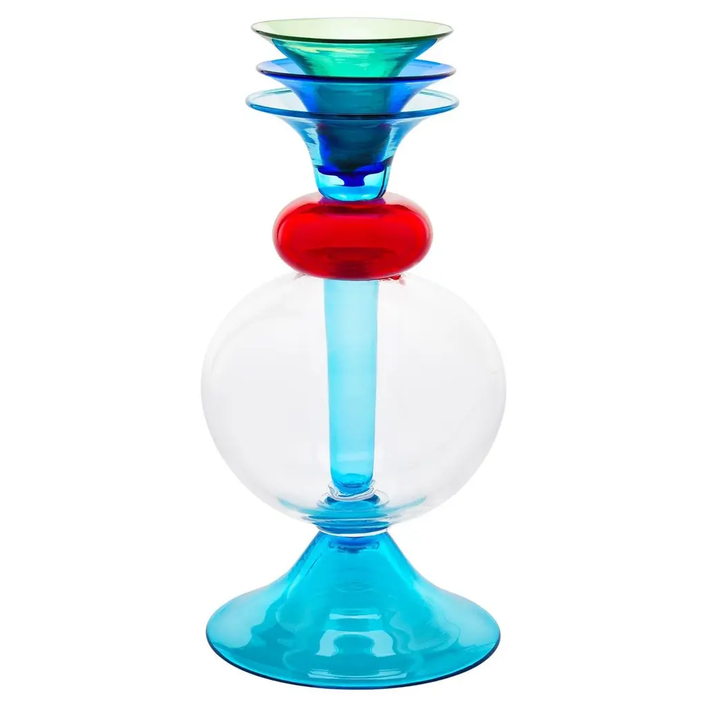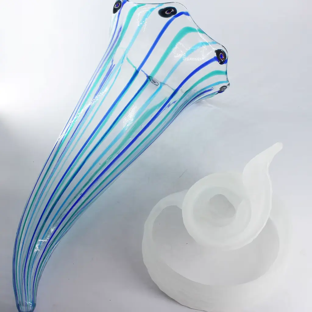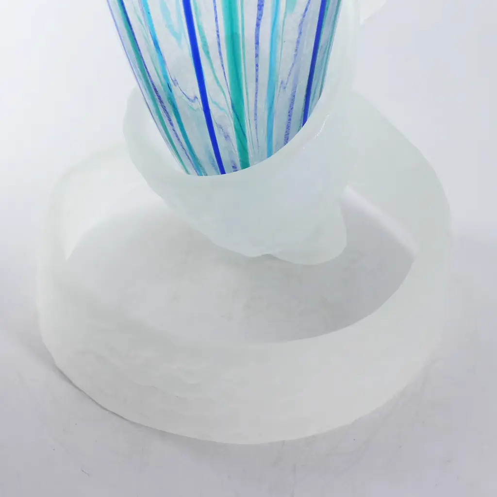 This grand cornucopia vase features a unique two-piece design that creates striking visual harmony. The set includes a transparent glass base and a delicately crafted vase that fits seamlessly into it. Handcrafted on Murano Island, it showcases intricate Murrine patterns and vibrant blue and aquamarine canes, reflecting exceptional artistry and vibrant elegance. A true statement piece for any space.