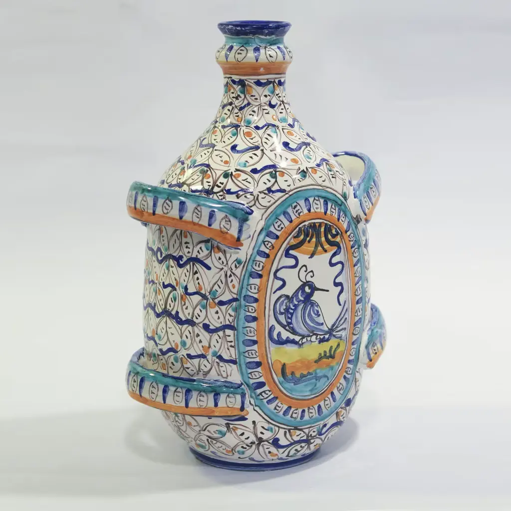 Inspired by the historic Medieval Florentine flask, this astonishing vase is entirely handcrafted, glazed, and painted with the traditional majolica technique by Lorenza Adami for Sbigoli Terracotte master ceramic atelier. Featuring a gracefully curved bottle shape with 4 quaint side handles, this unique objet d'art boasts stunning traditional decorative hues of vibrant turquoise, yellow, orange, and blue with a central small bluebird ("uccellino" in Italian). A superb showcase for a single bloom or small bouquet of dried flowers, or simply as a distinctive decorative piece.