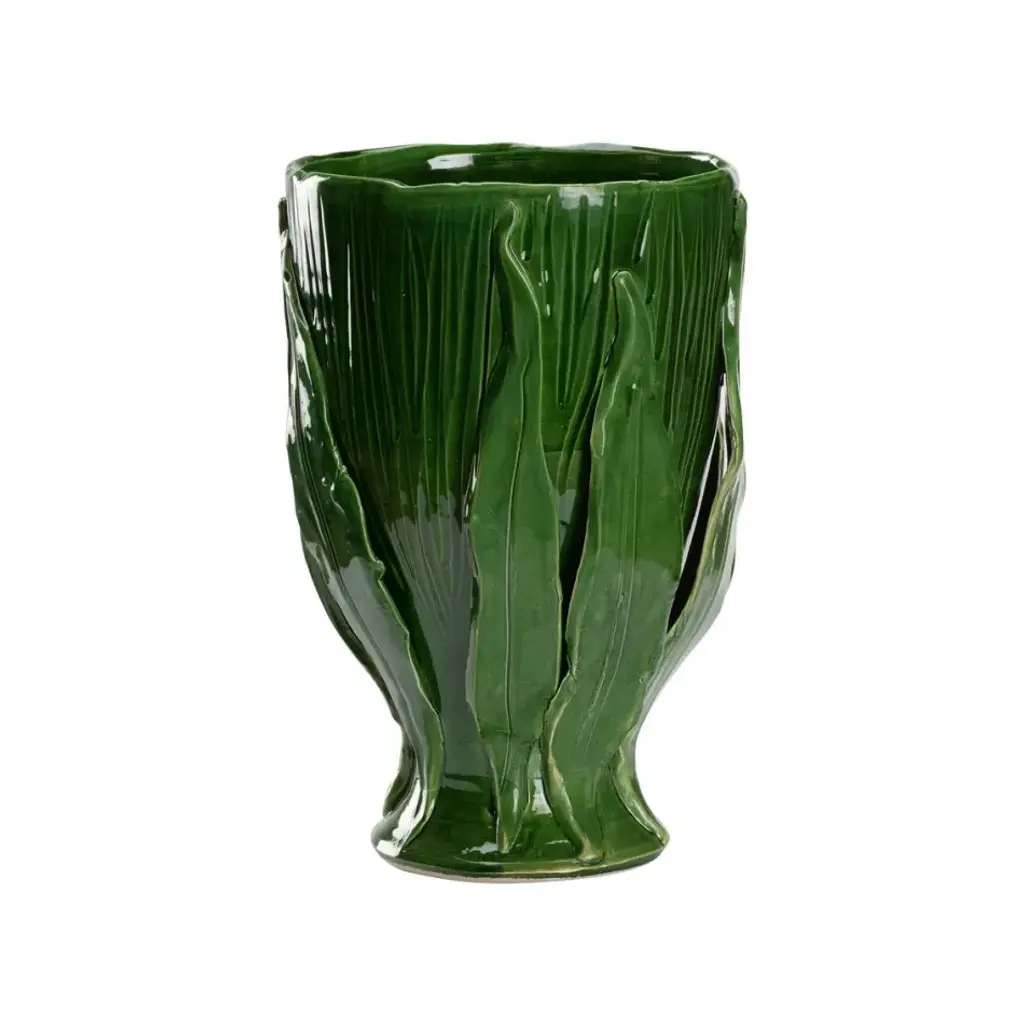 A touch of rustic décor with a hand thrown Italian ceramic vase with a rich glaze. The softness of the climbing leaves brings texture and dimensions to the Umbria Footed Vase in green.