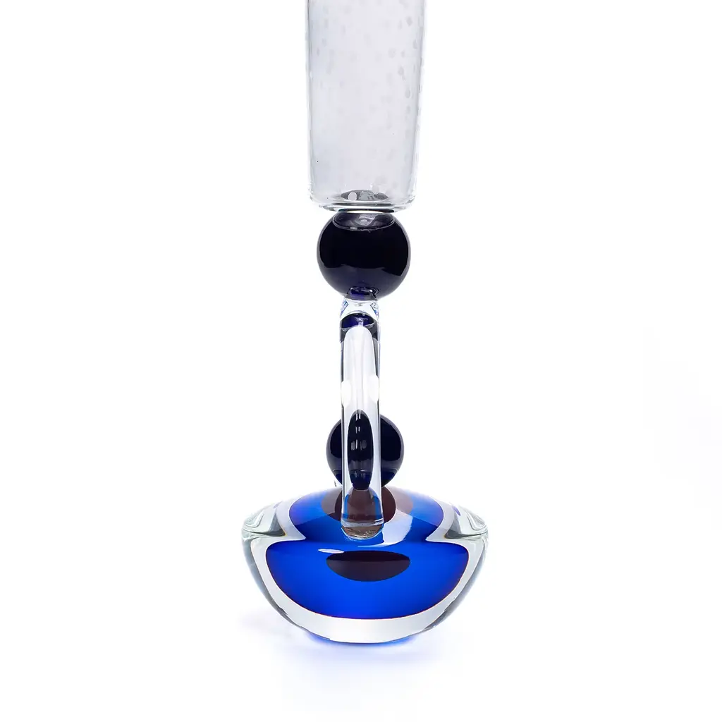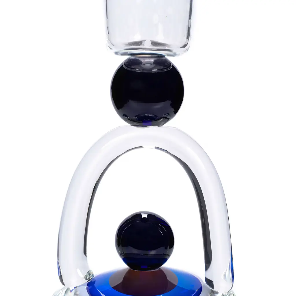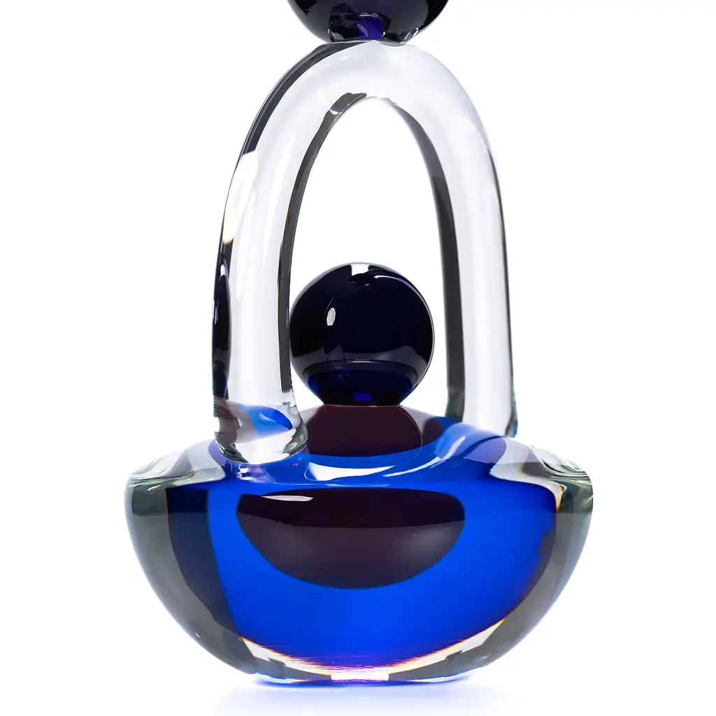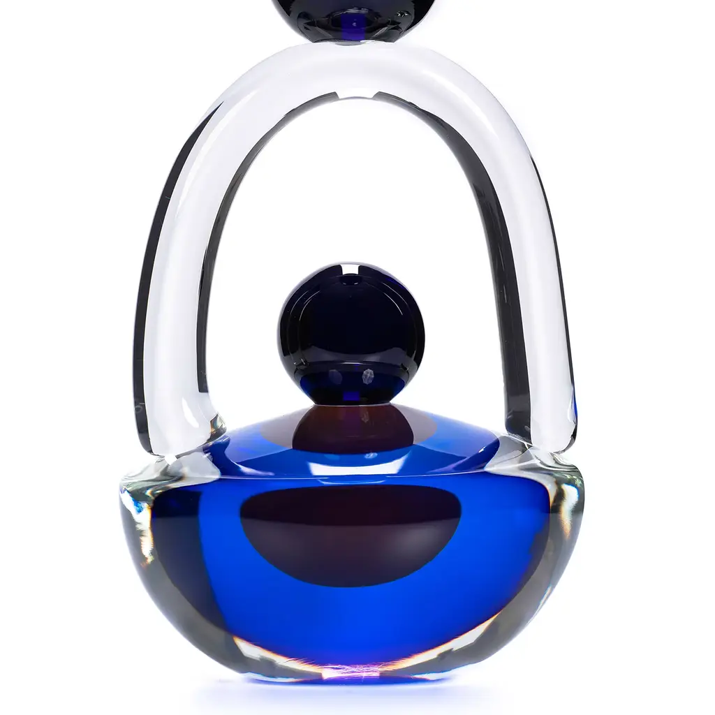Crafted with precision by the artisans of Officine di Murano 1295, this glass vase-sculpture is a technical masterpiece and one of the most captivating pieces in the collection. Part of a limited edition of six, each unique, it features a blown crystal neck, heat-formed and set into geometric black glass elements for a dynamic, original look. The Murano submerged glass base showcases expertly blended colored glass for a flawless finish.