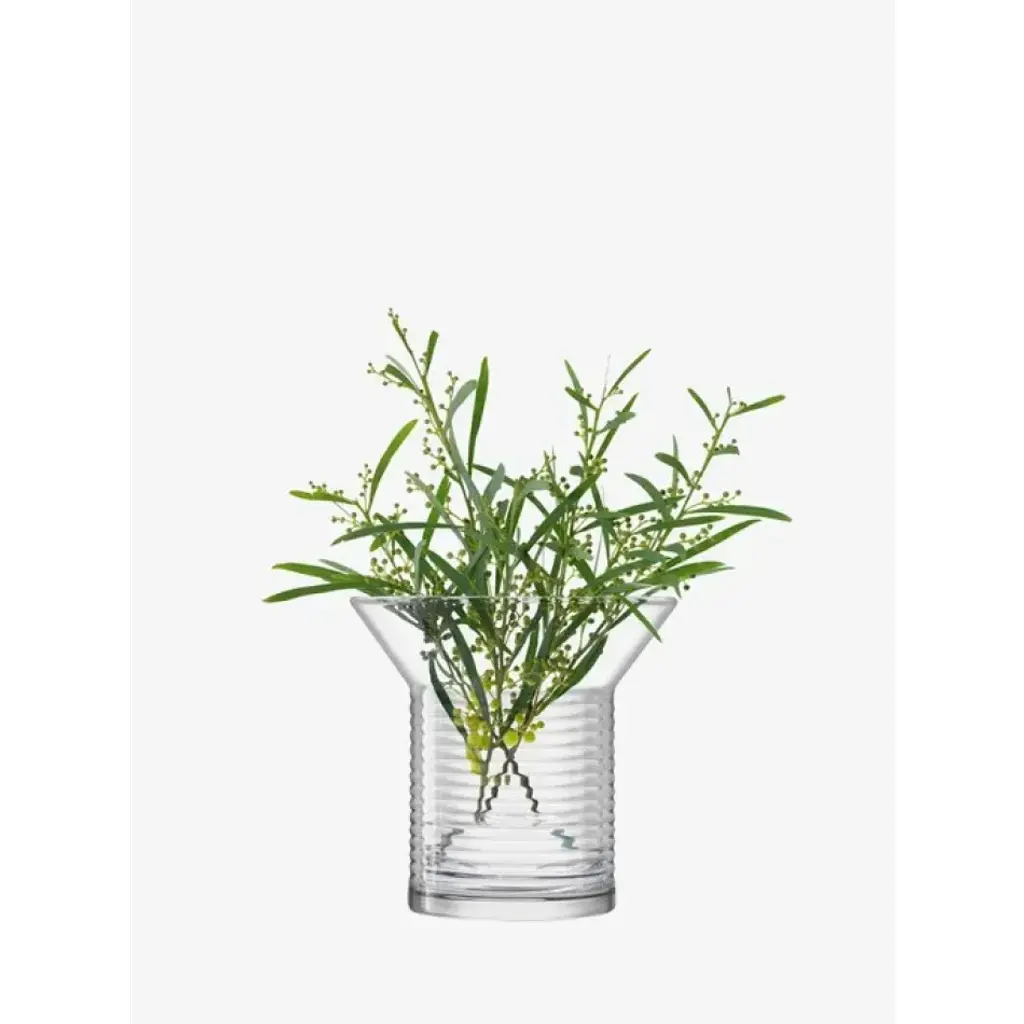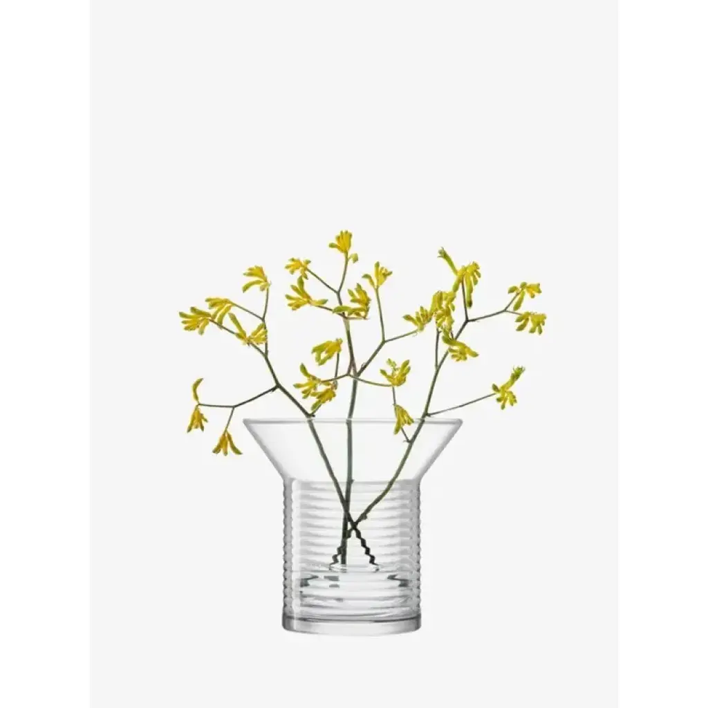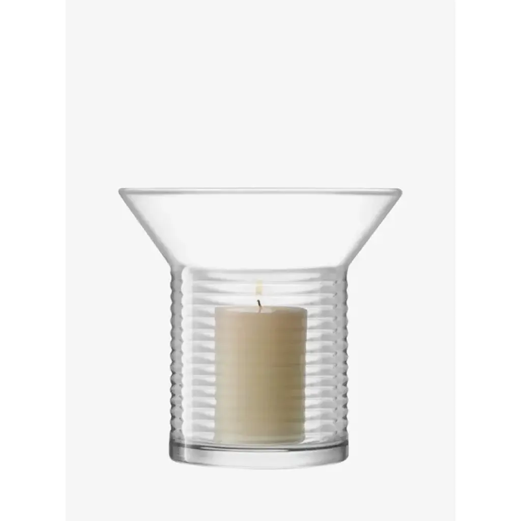 A contemporary mouth-blown vase/lantern that combines a finely ribbed body with a smooth flared collar. Suitable for displaying medium sized bouquets or using as a lantern to create refracted ambient candlelight.