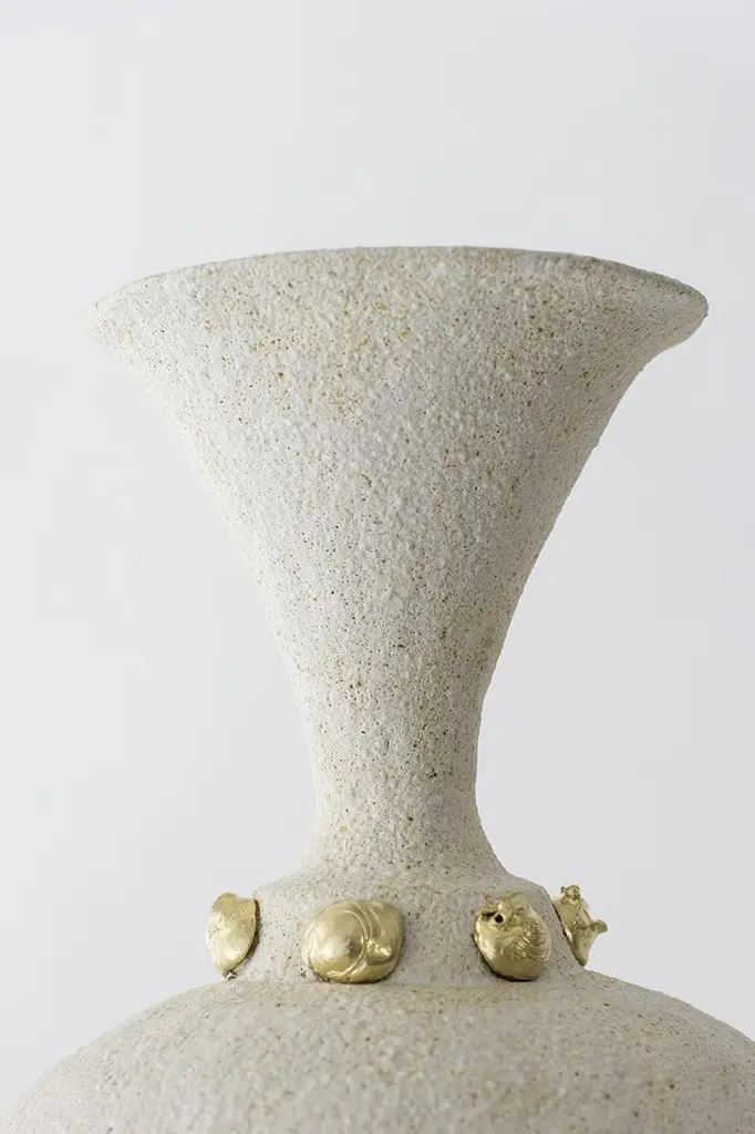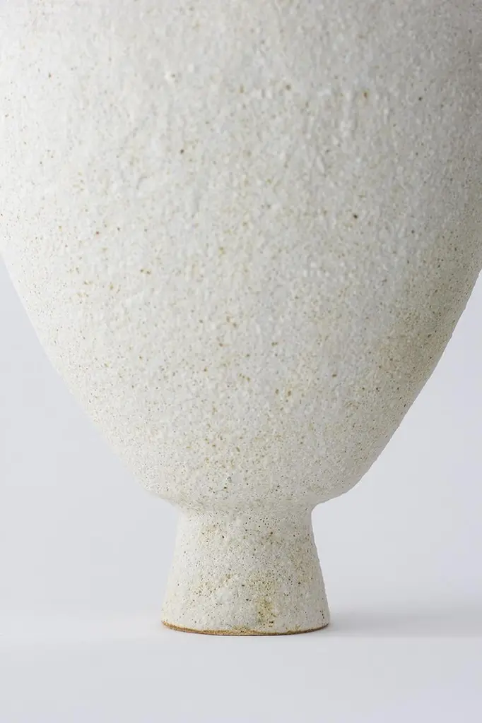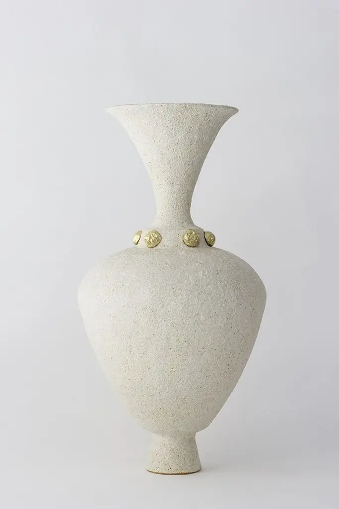 Unique Isolated n.24 vase by Raquel Vidal and Pedro PazDimensions: Ø 23 x 43 cmMaterials: hand-sculpted, glazed potteryThe pieces are hand built white stoneware with grog, and brushed with experimental glazes mix and textured surface, resulting in slight variations with each piece. No watertight. Made in Valencia, Spain.Raquel Vidal and Pedro Paz Craft pottery and jewelry that seeks to preserve ancient techniques and aesthetics. Their work is defined by a deep respect for materials, metal and clay being the primary raw materials with which they work. Both of these elements have been used since the beginning of humanity to not only make tools and supplies but also for creating objects to contemplate and connect with our bodies and environment. Pottery and jewelry have worked together in each society’s development, mutating and showing the interests, needs and concerns of a given era.Raquel and Pedro believe these ancient arts also help us understand our ancestors, get closer to them and experience how they felt materials and shapes. The Material connections between metal and clay are also of interest. Both materials have long and slow production processes and an intimate connection with fire, a somewhat rebel and magic element, that humanity has always craved to control.This belief that materials and the processes applied to them can transform the artist into a restorer of old sensibilities is foundational for Raquel and Pedro. Every piece is crafted slowly and methodically, there is no rushing in the process, and with a respect for the natural worl's own "will" to produce its own results.