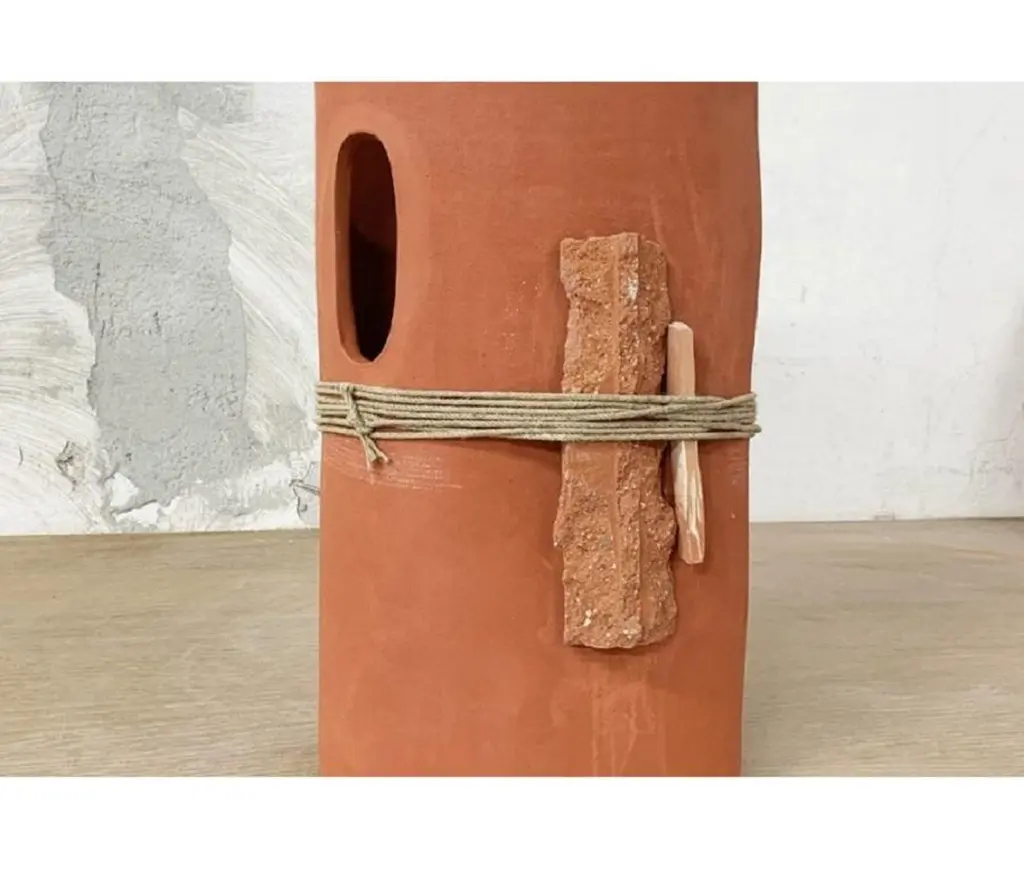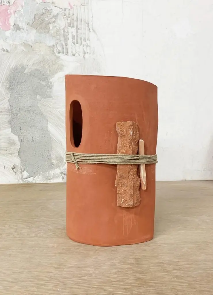 Unique Tatemono_hydra_01 sculpture vase by Emmanuelle RouleUnique pieceDimensions: W 20 x H 42 cmMaterials: Earthenware, natural hemp stringUnique handmade piece in terracotta earthenware, a brick piece and natural hemp string. With normal apparent micro-cracks. Not WaterprooofCreative studio founded in 2007 in Paris.Curious about new projects and encounters, the studio is characterised by a multidisciplinary dimension : design, art direction, space and contemporary art.Experimentation, research and fun."I work through research and experimentation with clay material. I have a specific approach to design and in the act of making, through multidisciplinary thoughtand using an empirical method whereby the material and its intrinsic properties (as well as the process of transformation) hold a central place in its conception.Working with clay raises the question of a perpetual back and forth between an ancestral material, an inherited savoir-faire, that has been transmitted from the past and its inscription in the contemporary creation as a material of multiple uses, with a strong environmental and sustainable dimension.On the border between crafts and contemporary art, its objects, sculptures and installations have a strong architectural dimension and question our relationship to the environment, to the territory and to the environment."